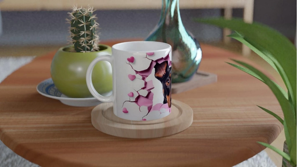 Beyaz zemin üzerinde pembe çatlaklardan sevimli bakışlarıyla bakan Rottweiler, sıcak içeceklerinize güçlü bir dostun enerjisini katıyor. Güçlü ama sevgi dolu bu tasarım, hem köpek severlere hem de farklı bir stil arayanlara özel bir alternatif sunuyor.