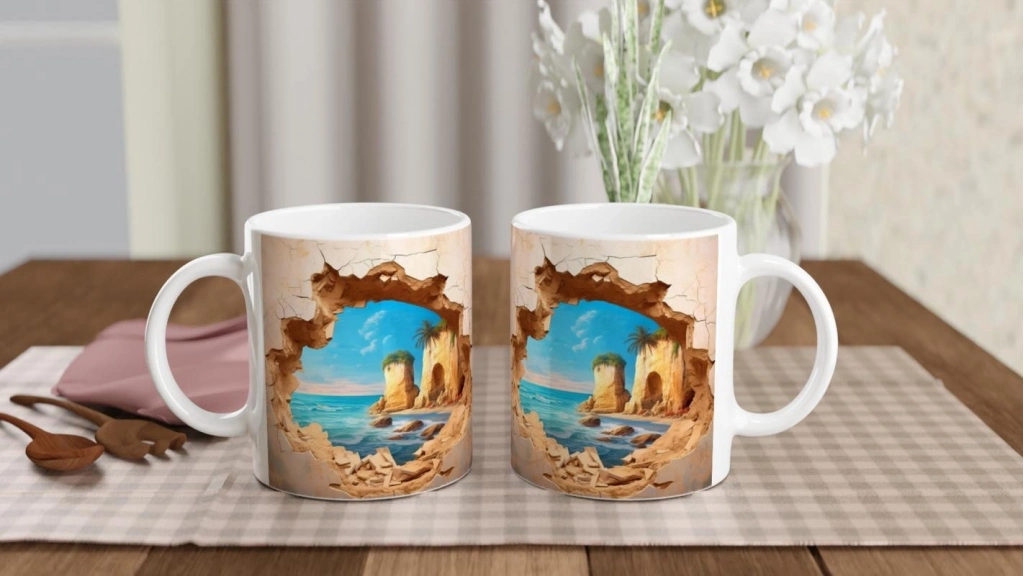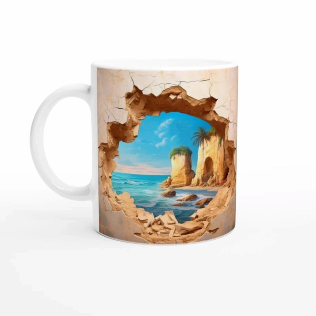 Duvarı Delen Tropik Sahil Manzaralı Baskılı Kupa Bardak, çatlak bir duvarın ardından beliren masmavi deniz, altın rengi kayalıklar ve palmiye ağaçlarıyla tropik bir kaçış hissi yaratır. Doğayla iç içe bir estetik arayanlar için ideal bir hediye seçeneğidir.
