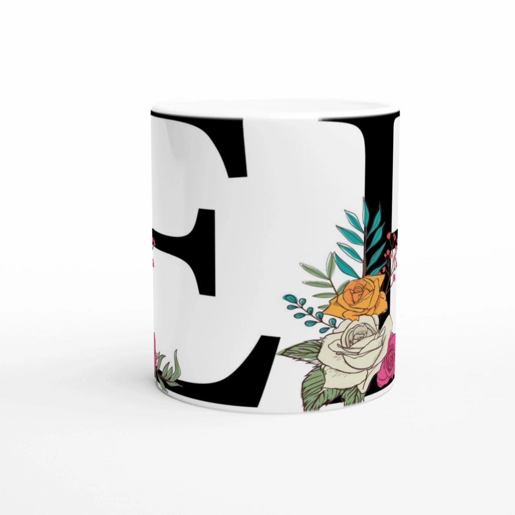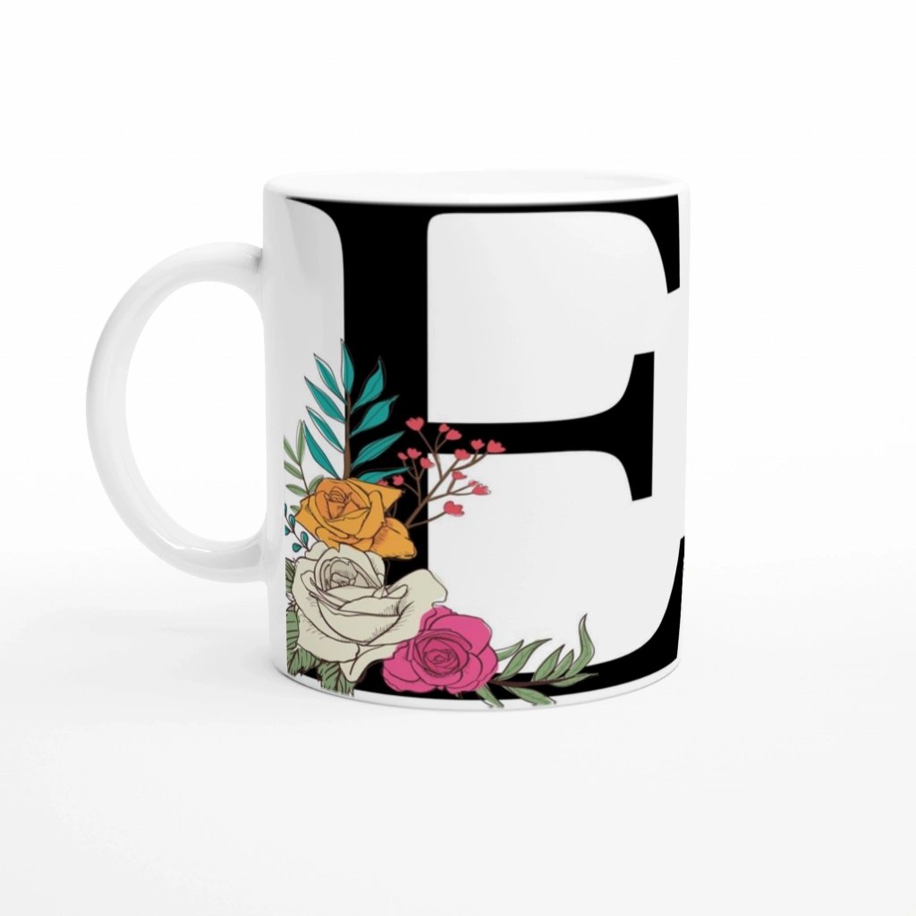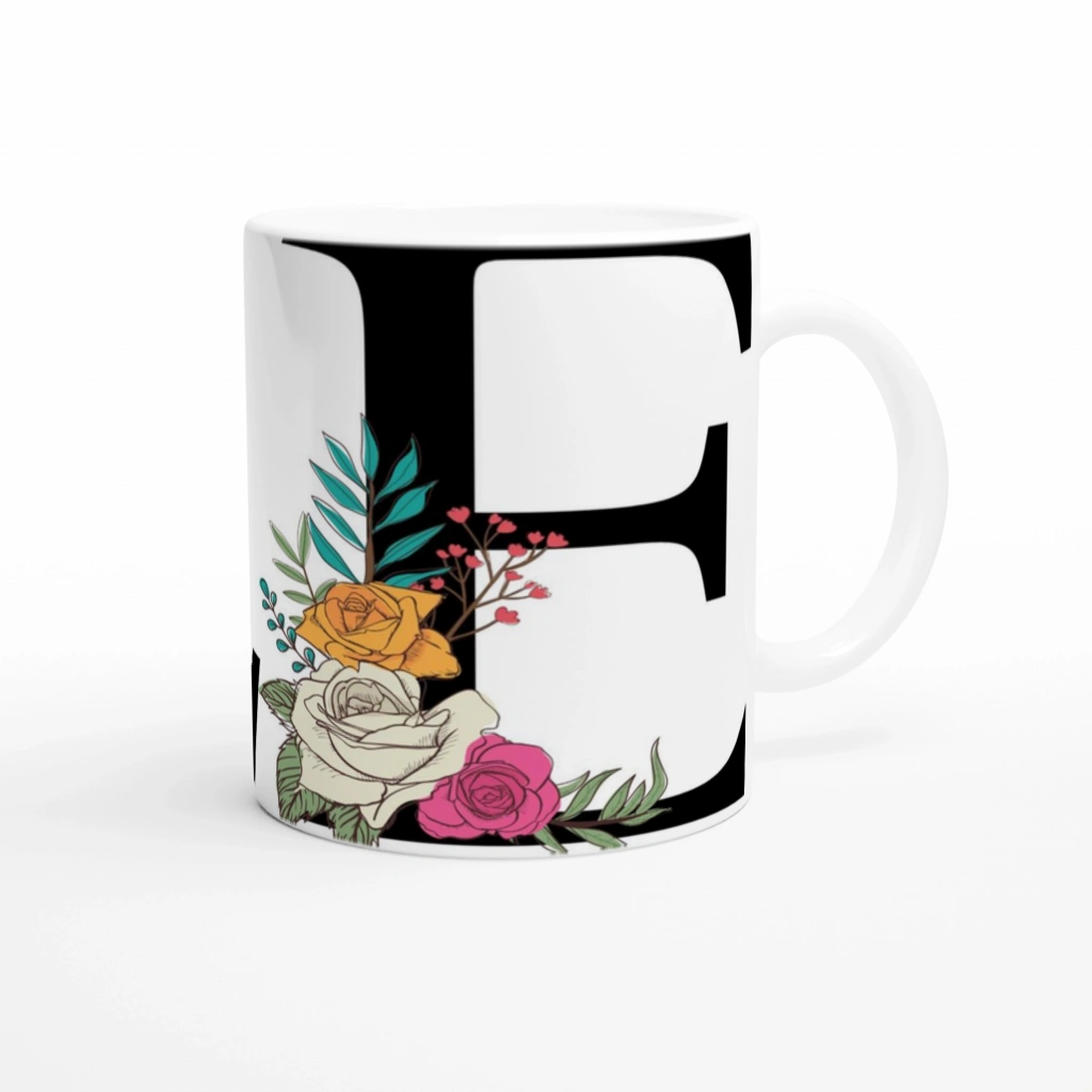 Turuncu, beyaz ve pembe çiçeklerin süslediği bu E harfi baskılı kupa, kişisel hediye arayanlar için benzersiz bir seçenektir.