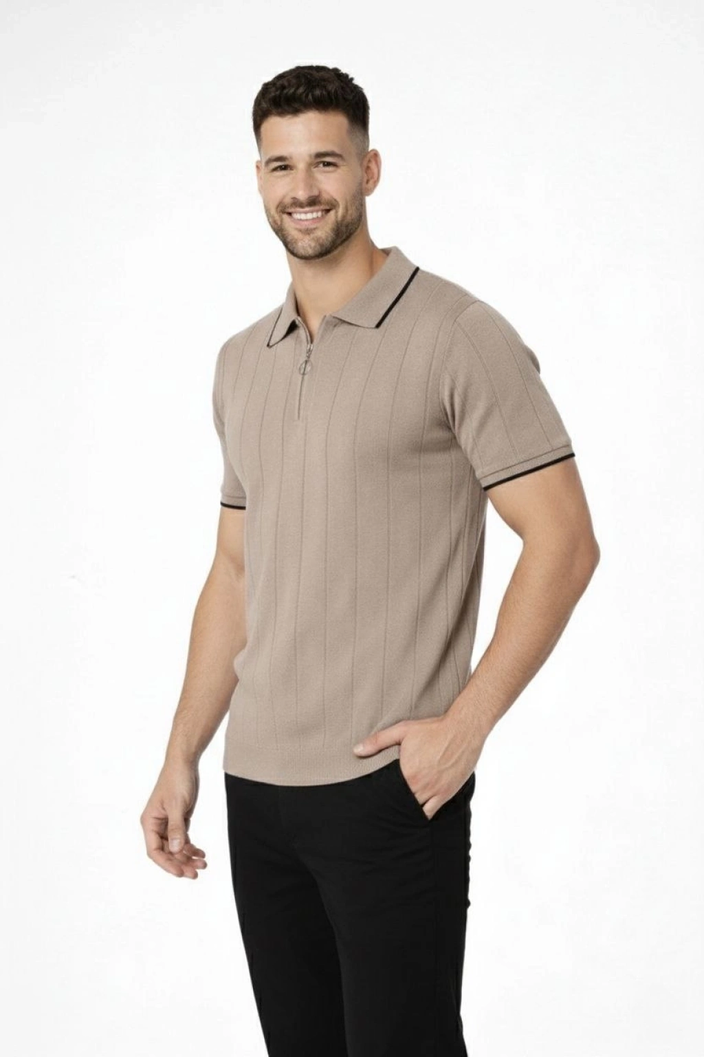 Erkek 3’lü Paket Dokuma Triko  Fermuarlı Yakalı Fitilli Kısa Kollu Regular Fit Tişört - Kahverengi, Haki, Siyah