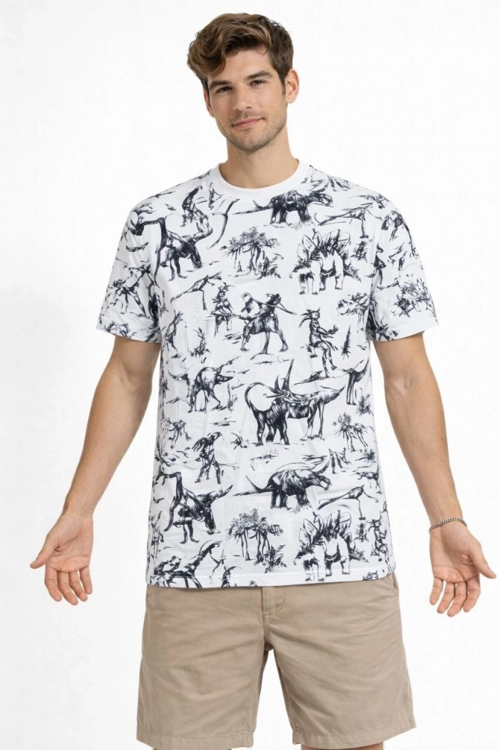 Erkek Beyaz Dinozor Desenli Tişört – Regular Fit, Bisiklet Yaka, Dijital Baskılı Pamuklu T-Shirt - Beyaz