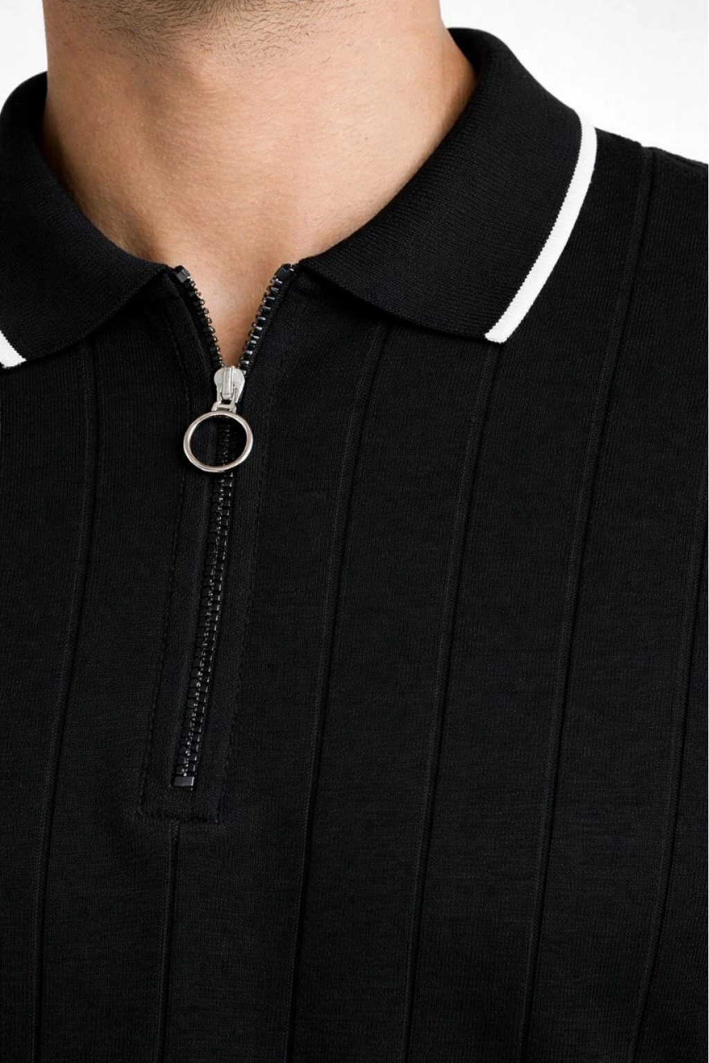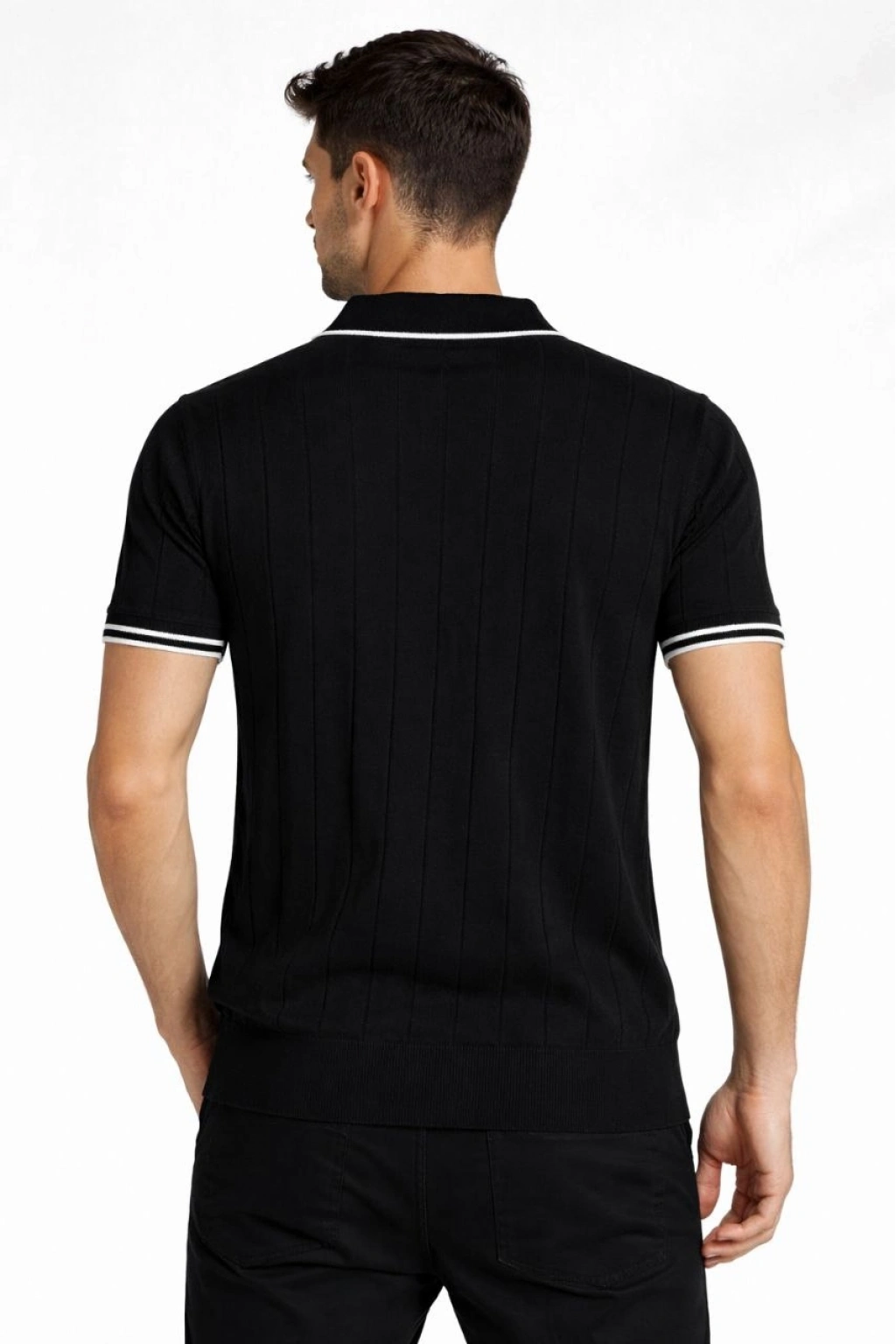 Erkek Fermuarlı Yaka Fitilli Triko Kısa Kollu Regular Fit Tişört T-shirt - Siyah