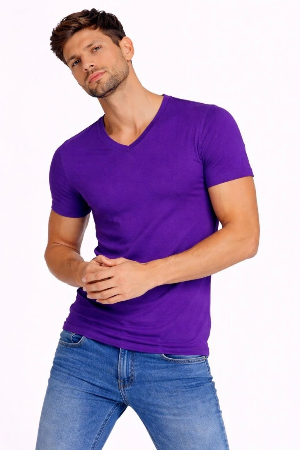 Erkek T-Shirt V Yaka Slim Fit dar kesim Likralı Tişört Günlük Basic Body - Mor