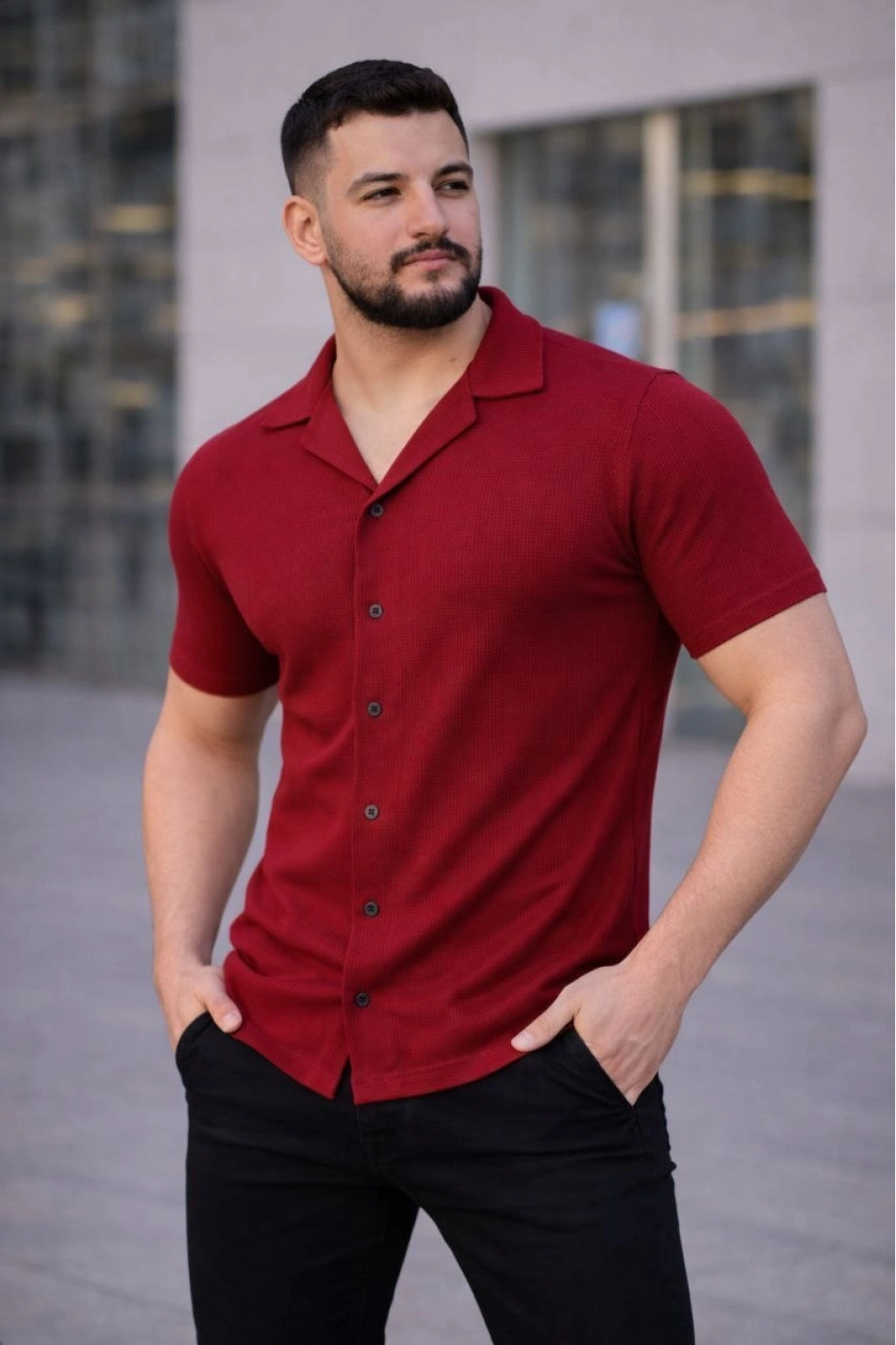 Erkek Waffle Kumaş Kısa Kollu Düğmeli Açık Yaka Regular Fit Gömlek - Kırmızı