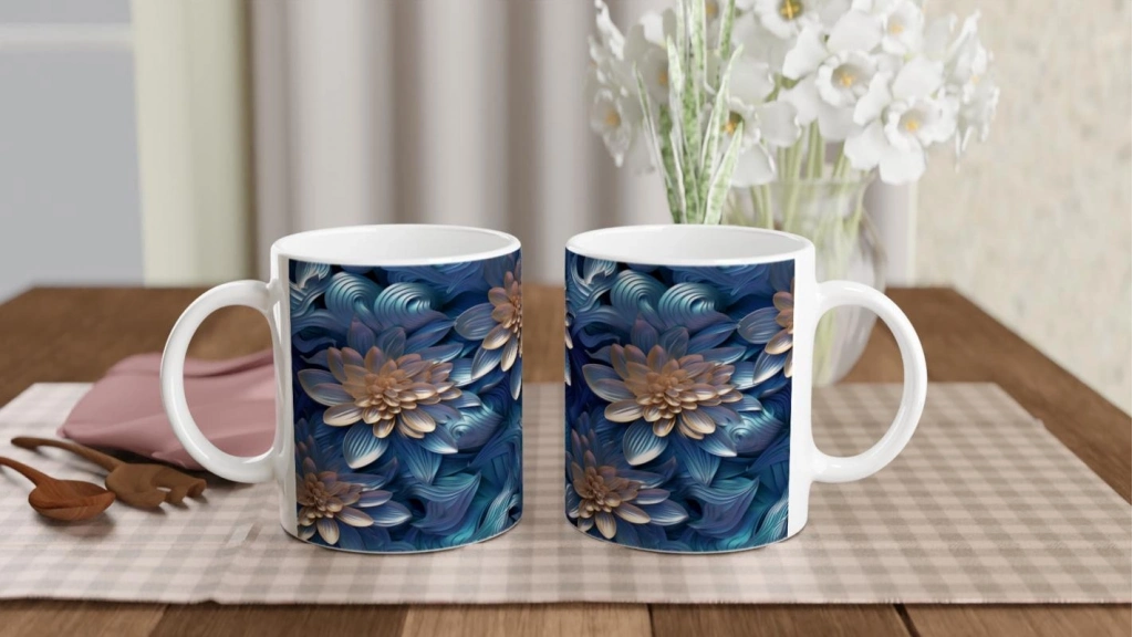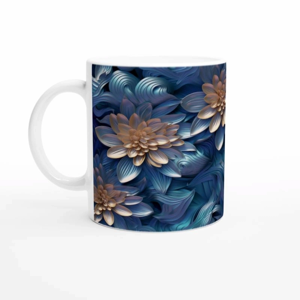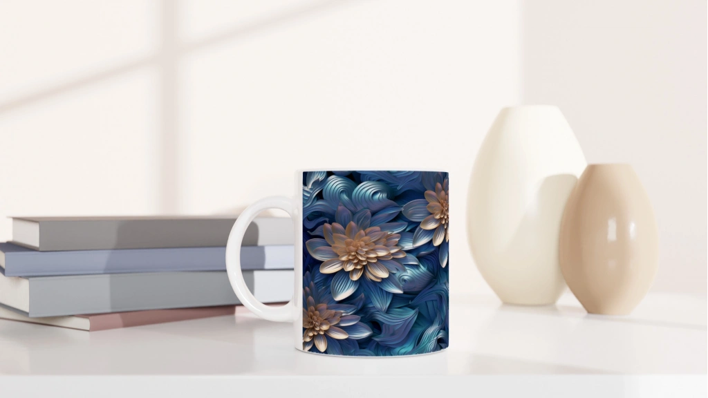 Derin mavi tonlarla bezeli, 3D çiçek detaylarına sahip bu çiçek desenli kupa bardak, sabah kahvenizi şıklıkla buluşturuyor.