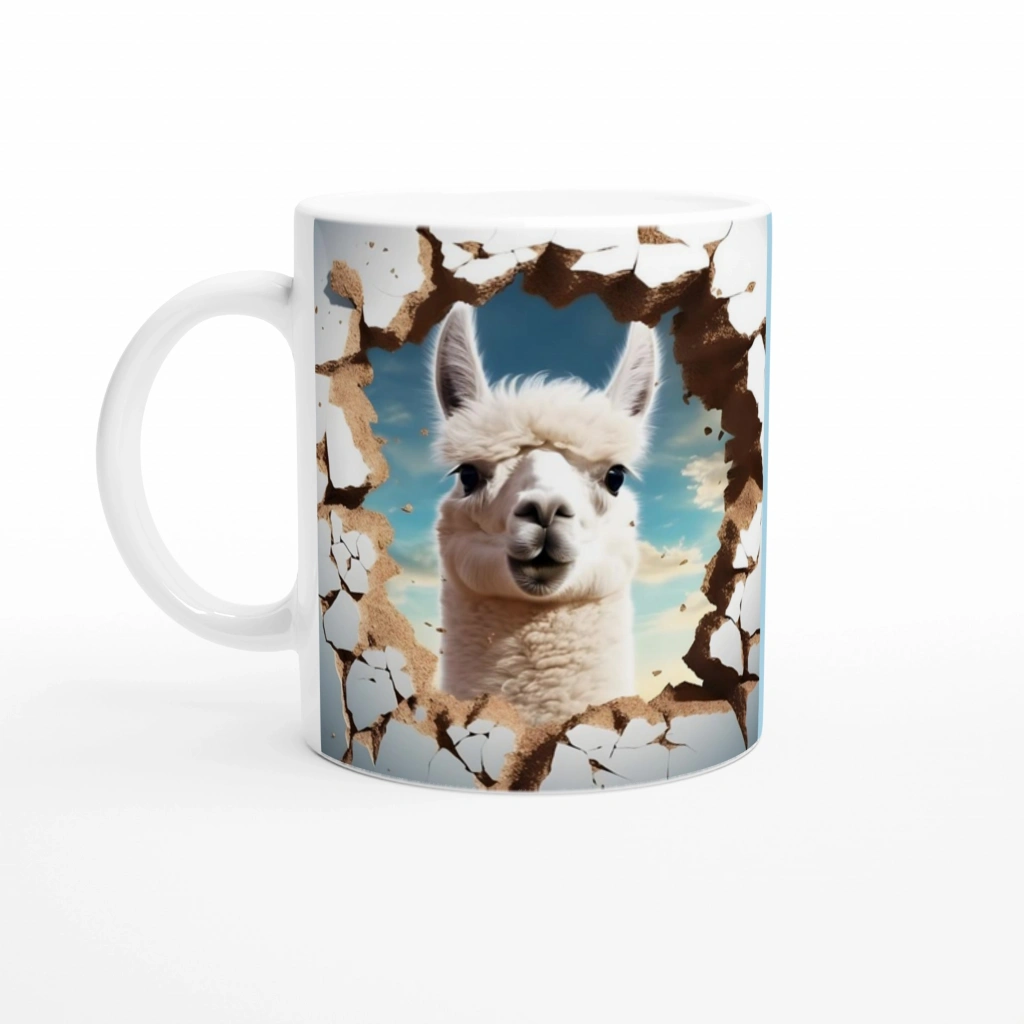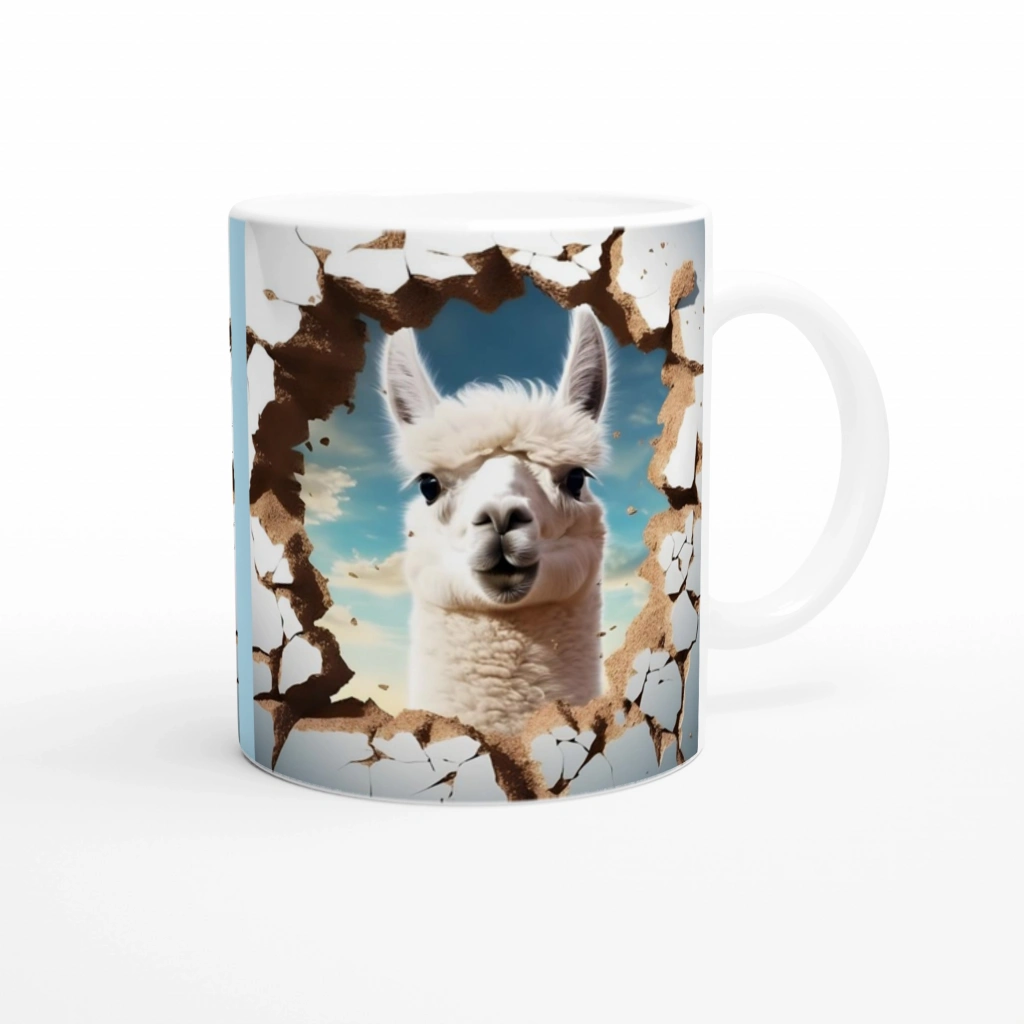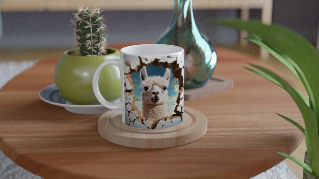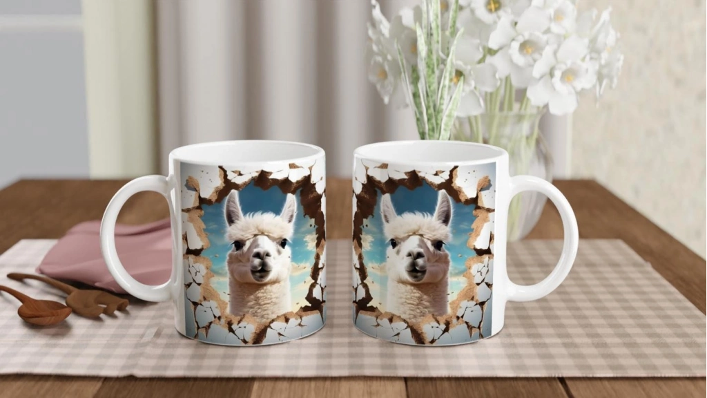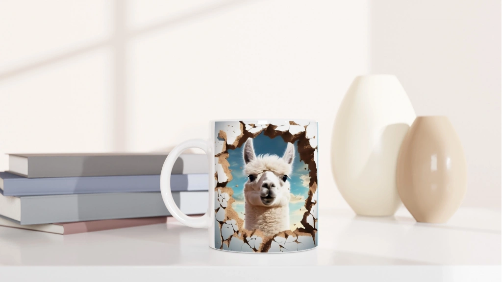 Gökyüzü arka planı ve duvarı delen etkileyici lama figürüyle tasarlanan bu baskılı kupa bardak,