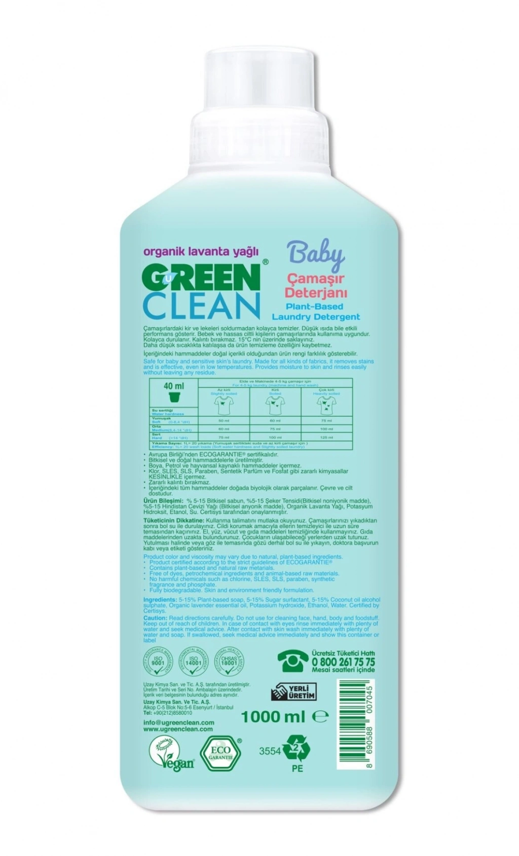 U Green Clean Baby Bitkisel Çamaşır Deterjanı, çamaşırlarınızdaki kir ve lekeleri soldurmadan kolayca temizler.