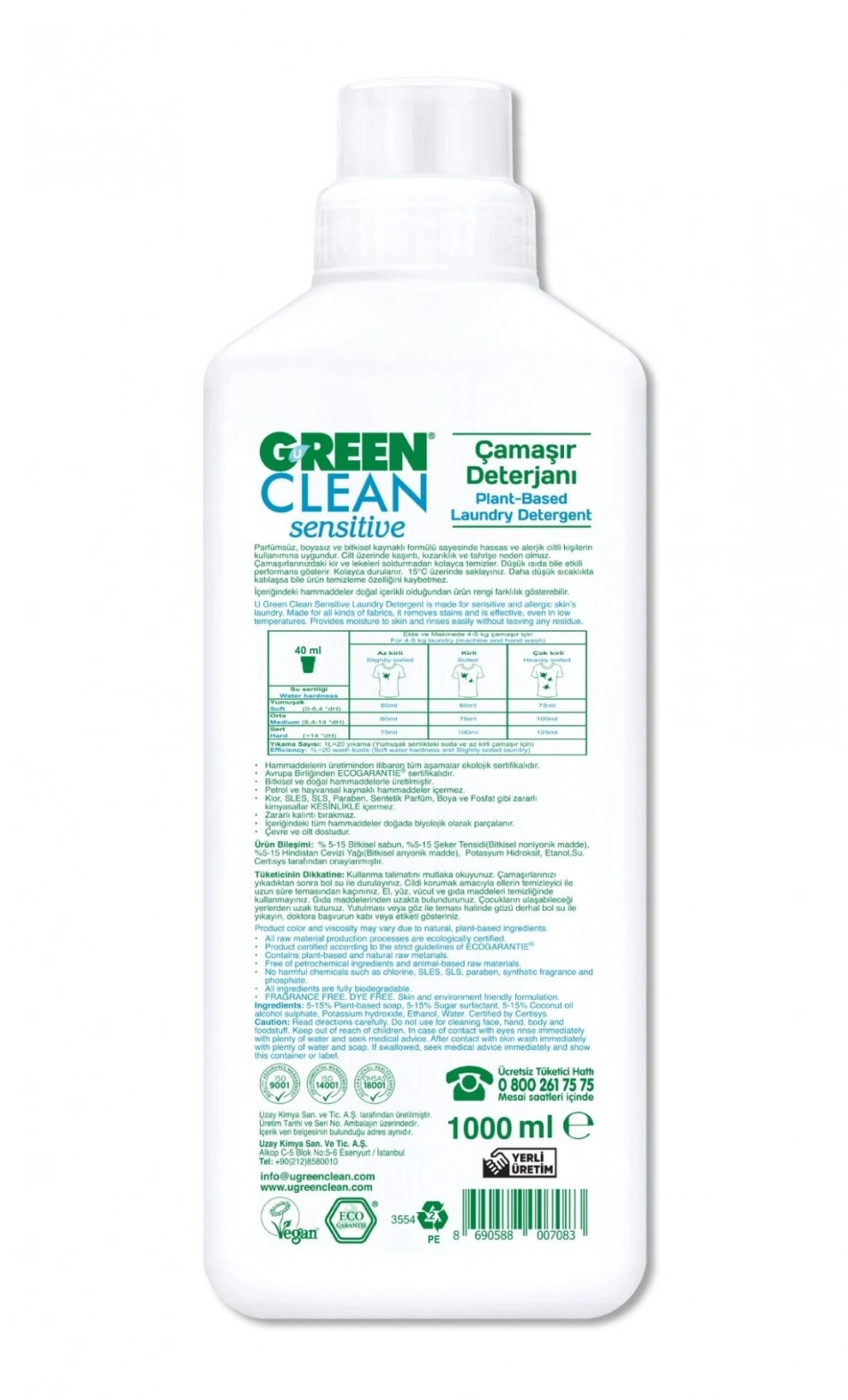 U Green Clean Sensitive Bitkisel Çamaşır Deterjanı, özellikle hassas ve allerjik ciltli kişilerin çamaşırlarındaki kir ve lekeleri soldurmadan kolayca temizler.