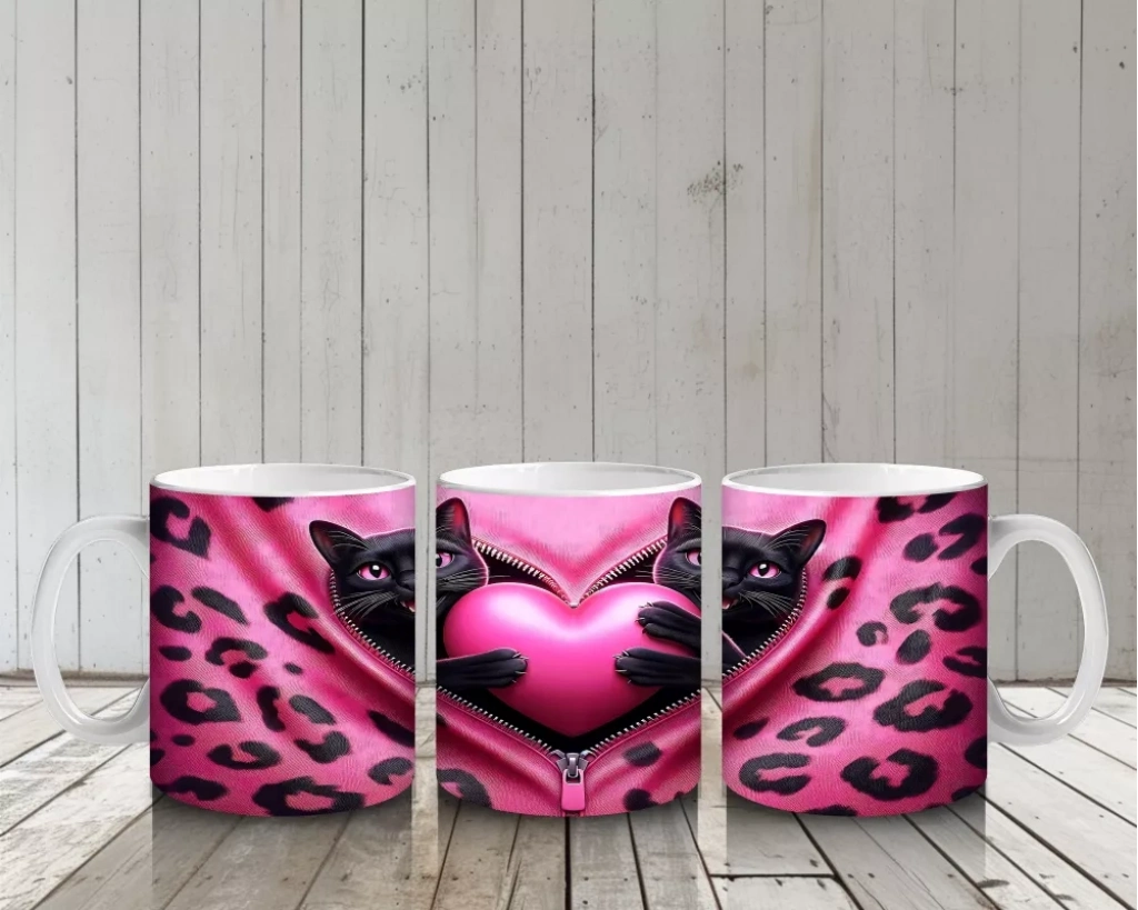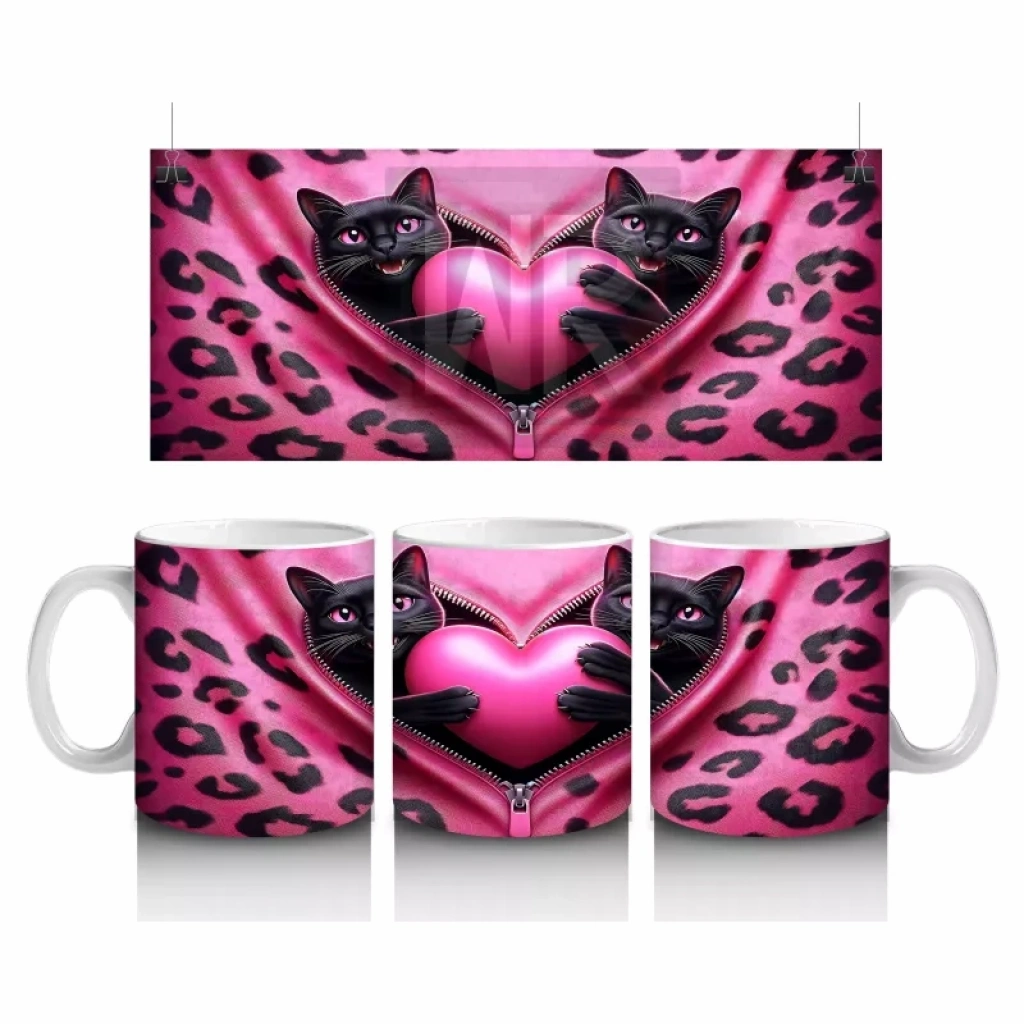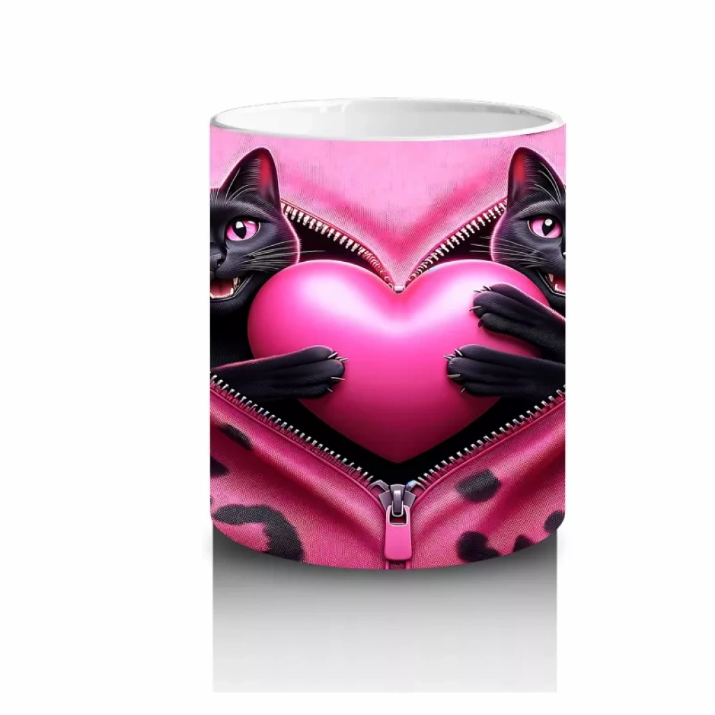 Gri tüylü kedilerin arasında kalpli peluş figürleri, samimi ve sevimli bir sahne oluşturuyor. İçten ve neşeli detaylardan hoşlananlar için ideal bir kupa.