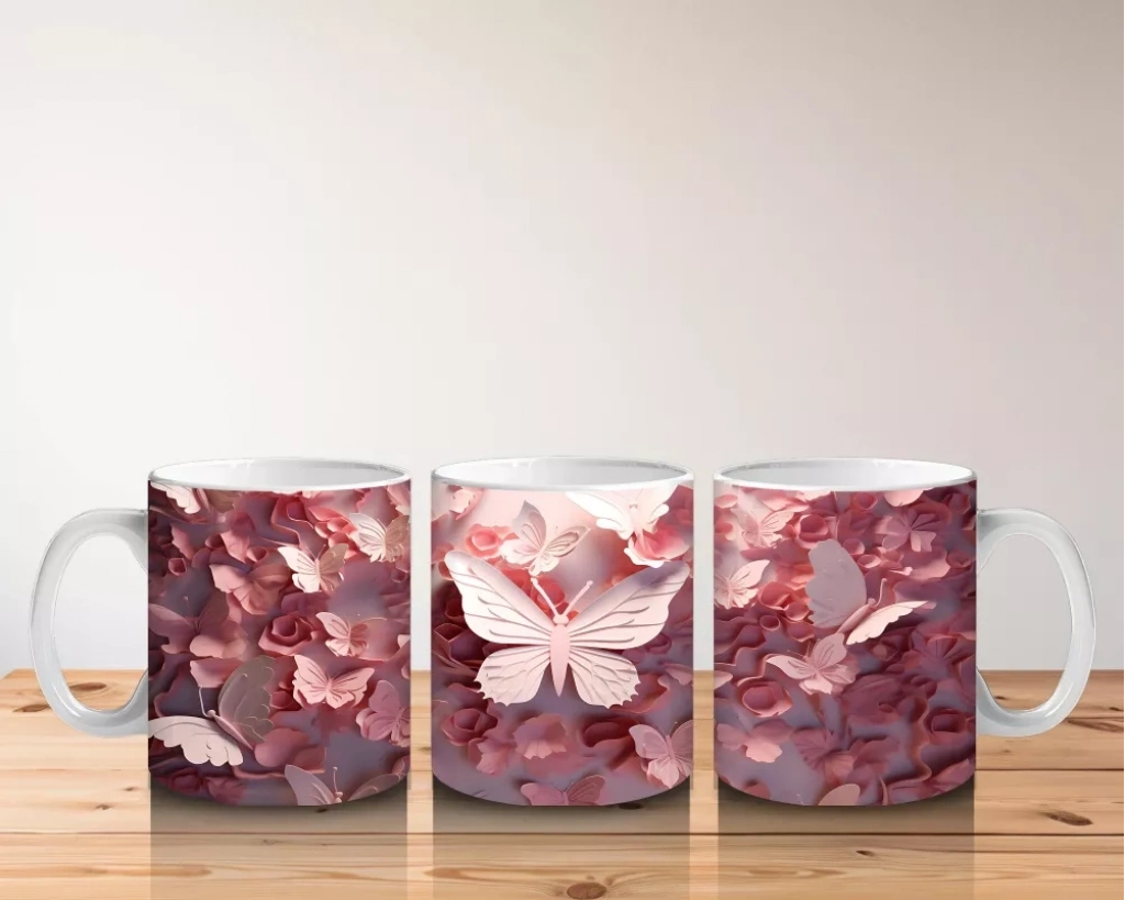 Güllerle bezenmiş zemin üzerinde duran beyaz kelebek, saflığı ve zarafeti simgeliyor. Çiçeklerle uyumlu yumuşak bir tasarım arayanlara özel, romantik bir kupa seçeneği.