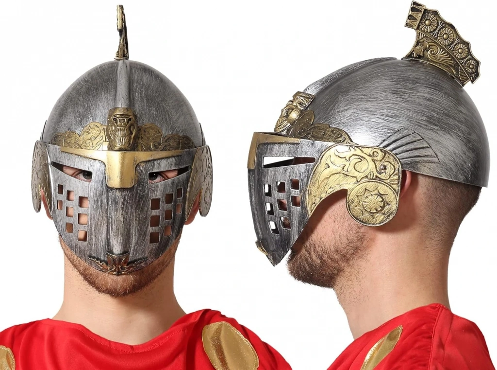 Bu Romalı Bizans kaskı miğferi, Gümüş ve Altın renkleriyle göz alıcı bir görünüme sahiptir. 25x20 cm boyutlarındaki bu miğfer, yetişkinler için standart ölçüdedir ve oynar başlıklıdır.