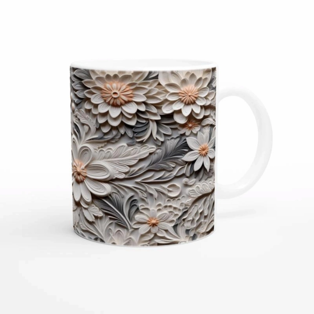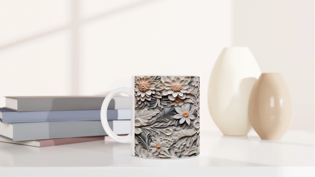 Krem ve gri tonlarının mükemmel uyumunu yansıtan bu rölyef çiçekli kupa bardak, sofistike bir görünüm arayanlar için tasarlandı. Gümüşe çalan gölgeler ve yumuşak bej çiçek detayları, her yudumda zaraf