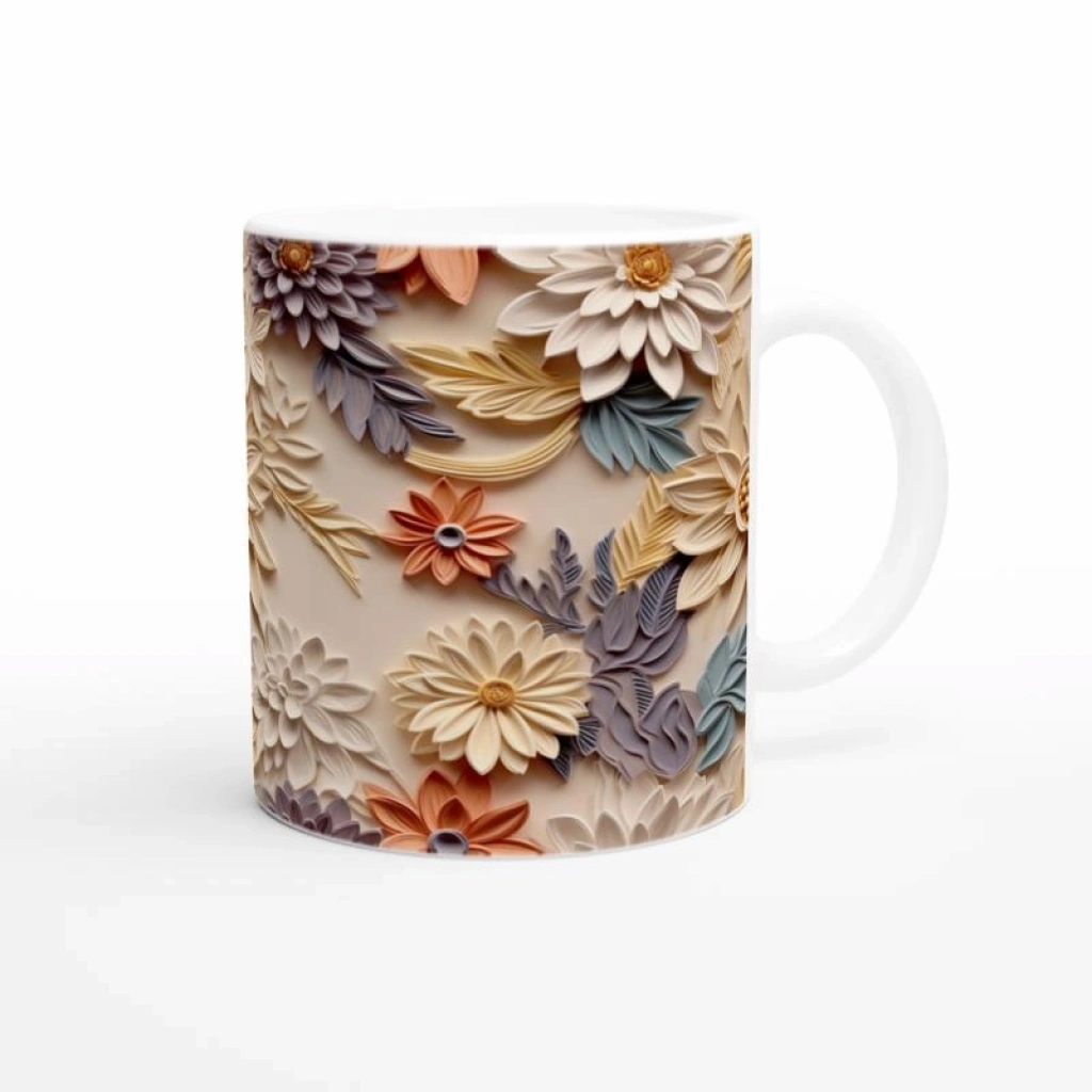Bej ve turuncu tonların yumuşak geçişleriyle bezenmiş bu rölyef çiçek desenli kupa bardak, gün batımının sıcaklığını zarif bir tasarıma dönüştürüyor. Yaprak detayları ve rölyef dokularla zenginleşen görünüm, dekoratif şıklığı ve sanatsal dokunuşu bir arada sunuyor.