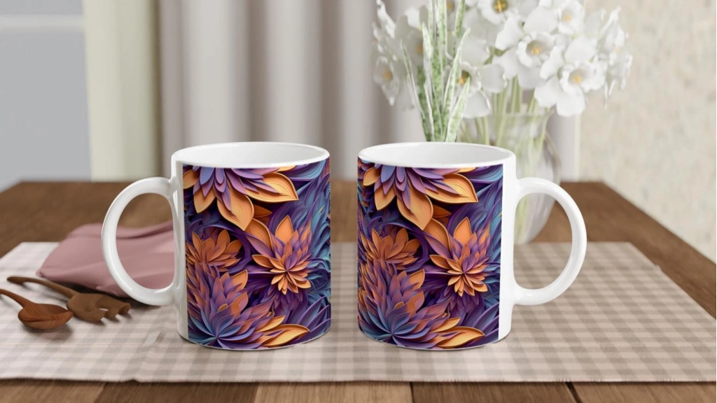 Gün Batımı Rüyası Çiçekli Kupa Bardak, 3D detaylarıyla sıcak ve dinamik bir atmosfer yaratırken içecek keyfinize sanatsal bir dokunuş katıyor.