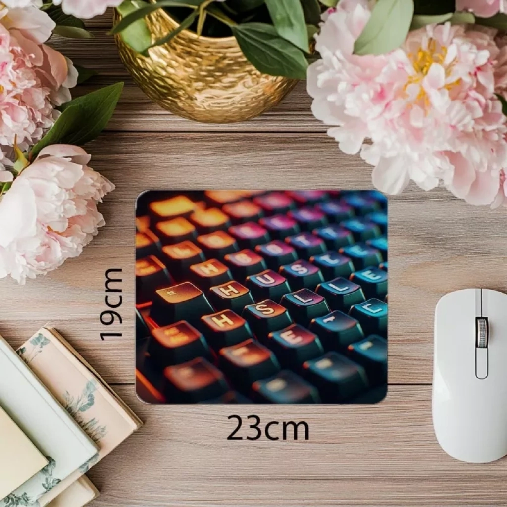 H-U-S-T-L-E yazılı parlak tuş mouse pad, parlak tuş detayları ve motive edici tasarımıyla odaklanmanızı destekler; pürüzsüz kaydırma yüzeyi ve kaymaz tabanıyla konforlu kullanım sunar.