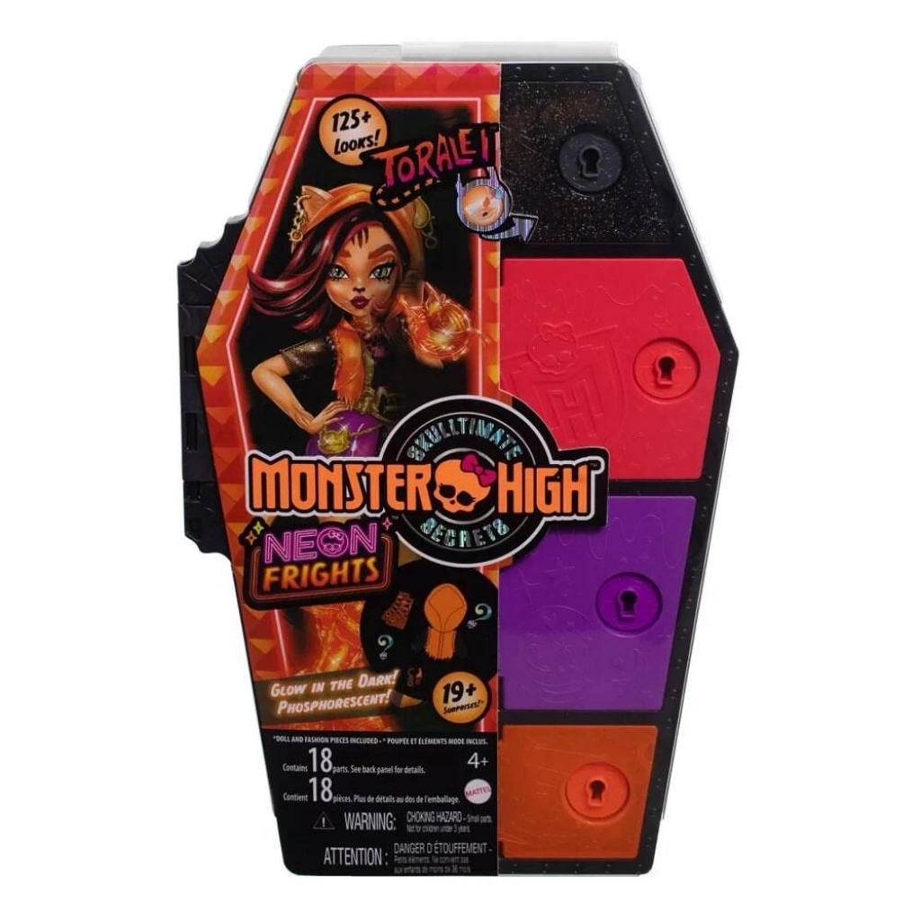 • Toralei Stripe bebeği cesur renkli saçları ve makyajıyla kendini ifade ediyor. Kolay saklama ve hareket halindeyken taşınabilirlik için onu ve tüm Neon Korkularını tabut şeklindeki dolabın içine koyun.