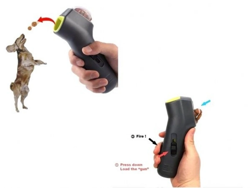 Köpekler İçin Mama Fırlatma Oyuncağı 17 cm Mama fırlatma oyuncağı, köpeğiniz ile birlikte aktivite için ideal üründür. Şeffaf akrilik mama haznesi bulunan bu ürün sert plastik malzemeden yapılmıştır. Mama fırlatma tabancası şeklindedir ve ön tarafta bulunan 40 ml hacimli şeffaf bölüme ödül maması veya kuru mama konulabilir. Tutma sapının yan tarafında açma kapama düğmesi bulunmaktadır. Ön tarafta bulunan düğmeye basılarak 4 metreye kadar mama fırlatılabilir.
