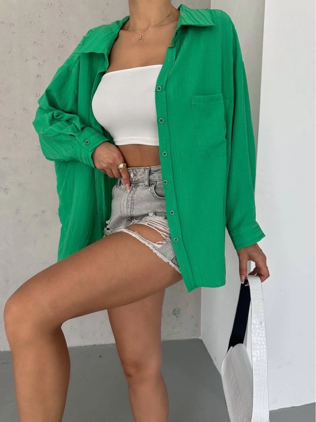 ÇOK SATAN marka ağaç kabuğu desenli oversize gömlek, şıklık ve rahatlığı bir arada sunuyor.