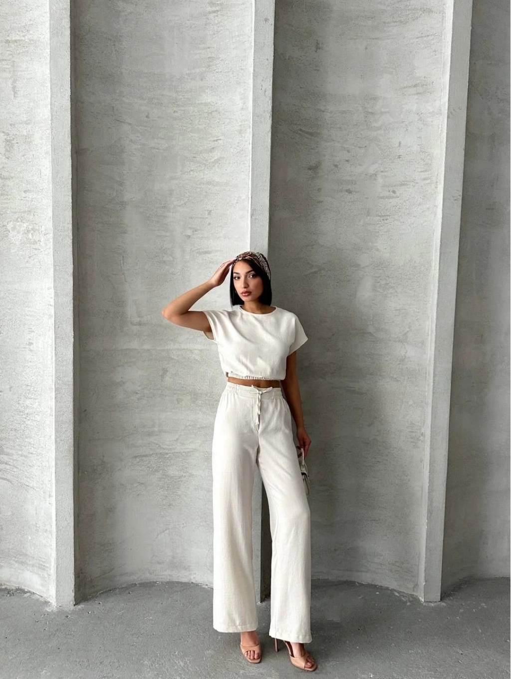 • Bluzunun düz kesimi ve pantolonunun yüksek bel tasarımı ile trend bir stil sunar.