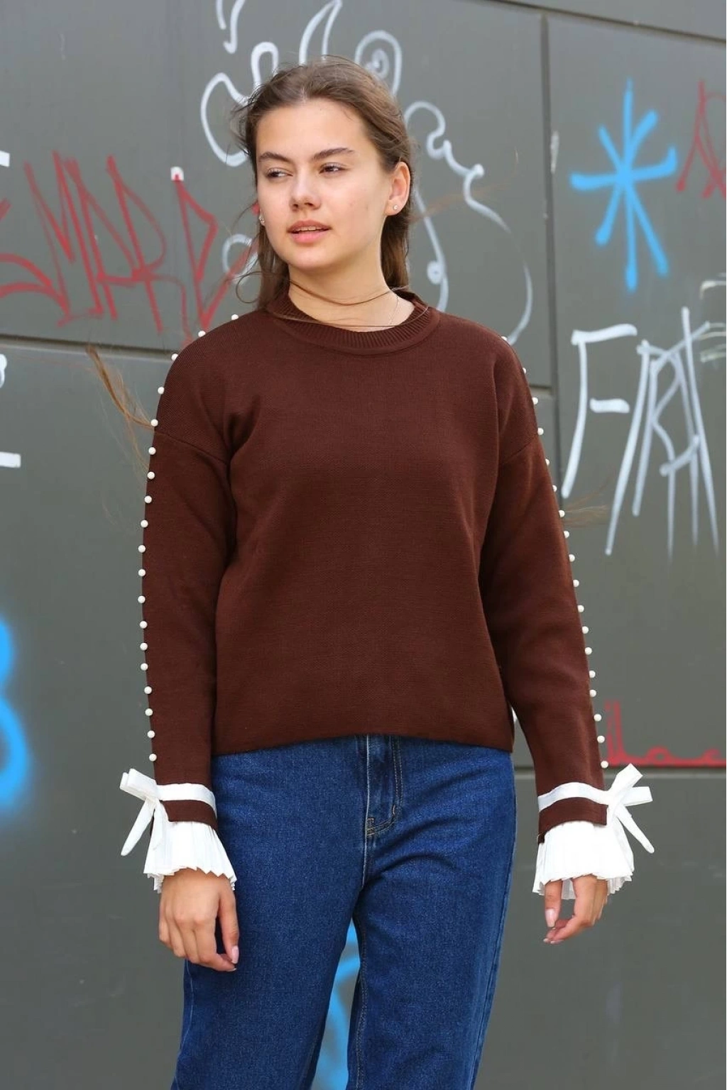 Boncuklu detaylarıyla şıklığı ön plana çıkaran Kahve Kazak, şıklığınızı tamamlayacak bir parça olacak.