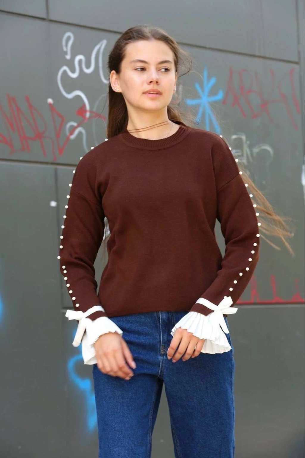 Boncuklu detaylarıyla şıklığı ön plana çıkaran Kahve Kazak, şıklığınızı tamamlayacak bir parça olacak.