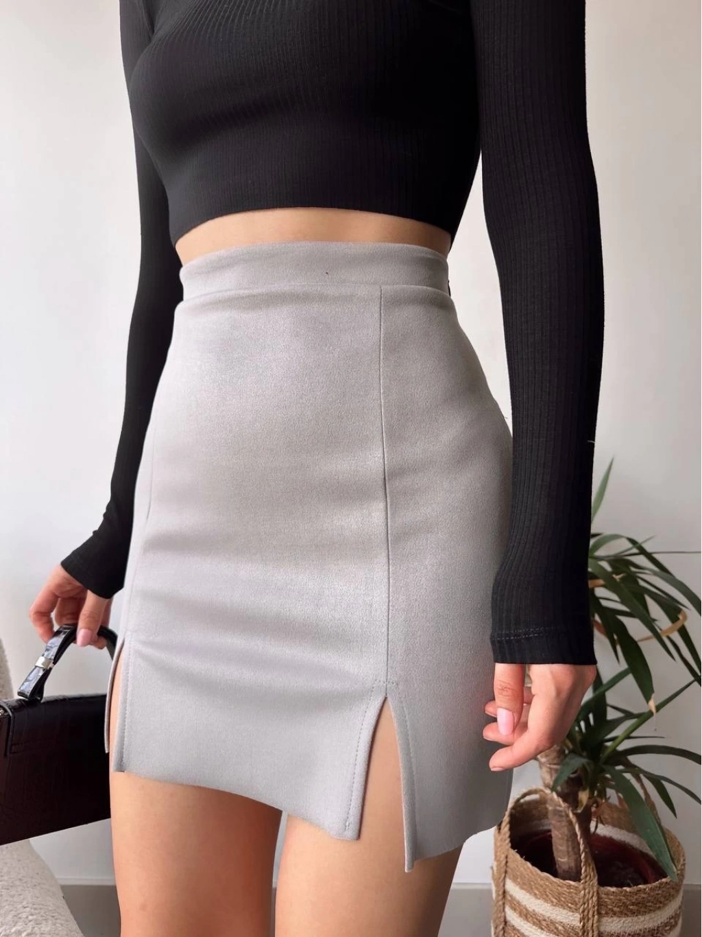 Şık ve şıklığıyla ön plana çıkan Çift yurtmaçlı süet etek gri s241002, gardırobunuzun vazgeçilmezi olmaya aday!