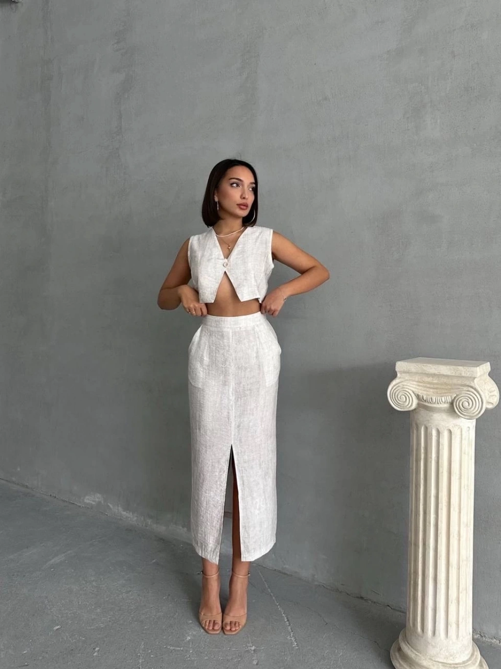 KAZAX markasının şık ve zarif tasarımıyla öne çıkan çilek takımı, etek ve yelek kombinasyonuyla dikkat çekiyor.