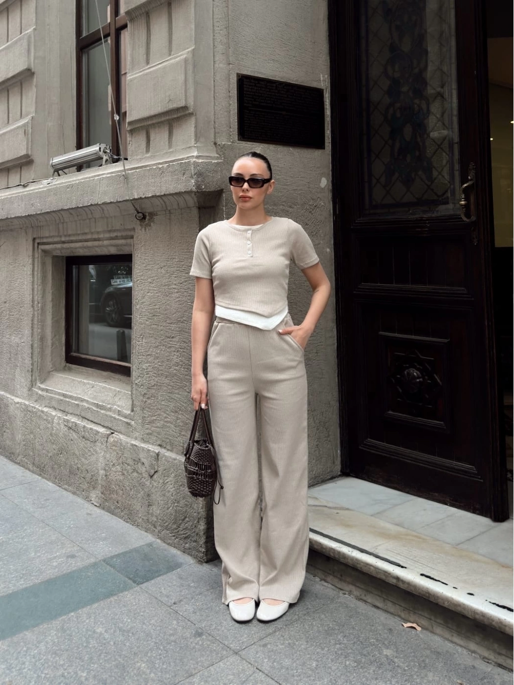 Şıklığı ve konforu bir arada arayan kadınların tercihi olan Düğme Yakalı Bej Alt Üst Takım S3943, her tarza uyum sağlar.