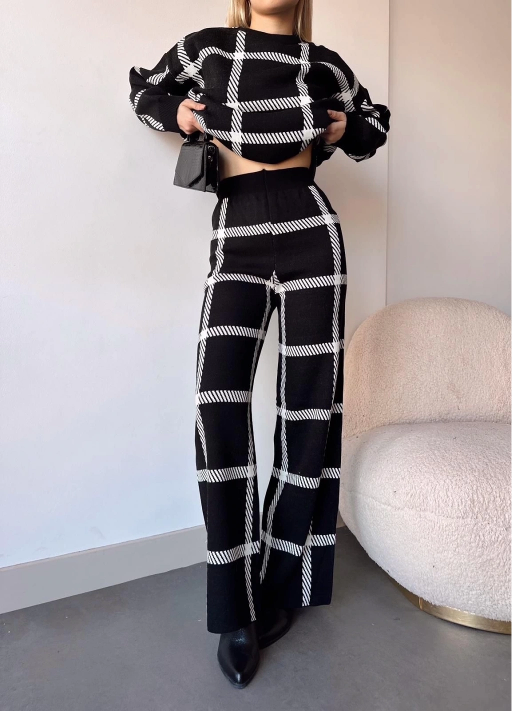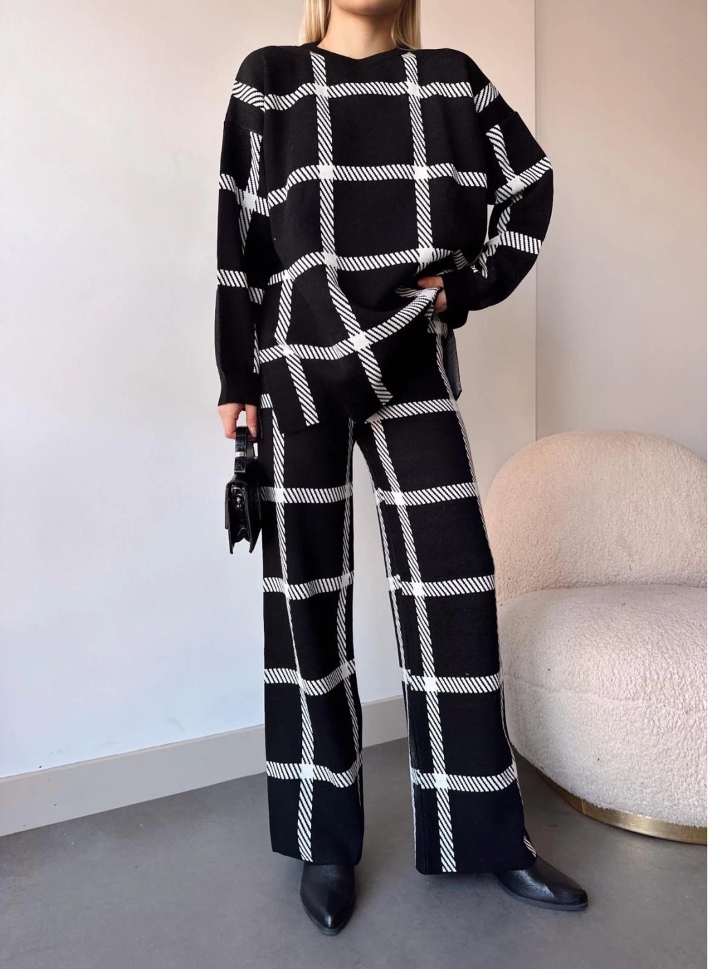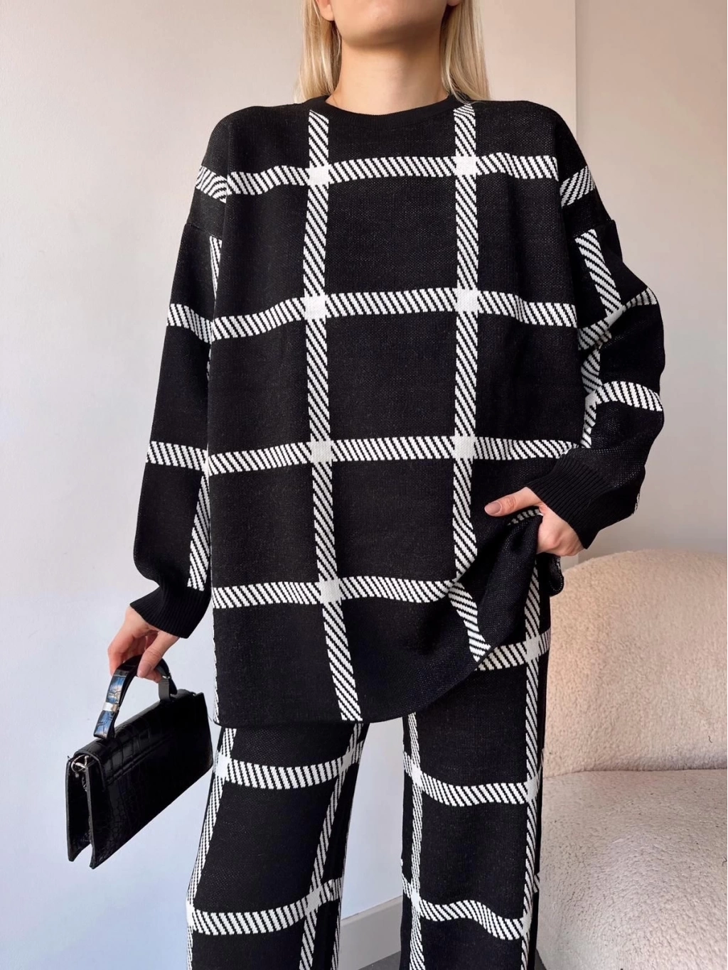 Şıklığı ve rahatlığı aynı anda yaşamak isteyen kadınlar için ideal bir seçenek olan Siyahbeyaz Ekoseli Triko Takım, gardırobunuzun vazgeçilmezi olmaya aday.