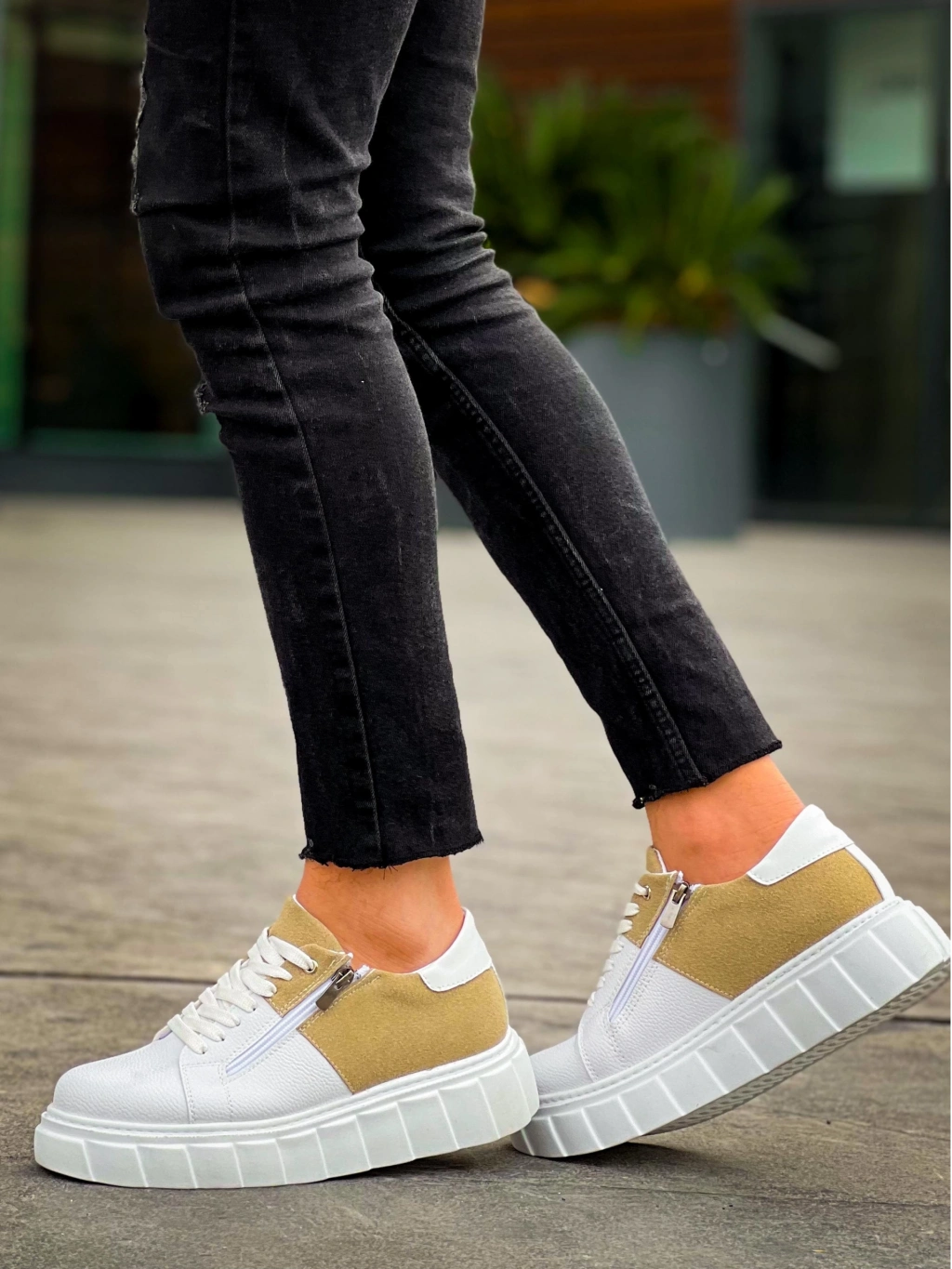 KB-X155 Beyaz Cilt Bej Süet Detaylı Beyaz Yüksek Taban Günlük Spor Ayakkabı