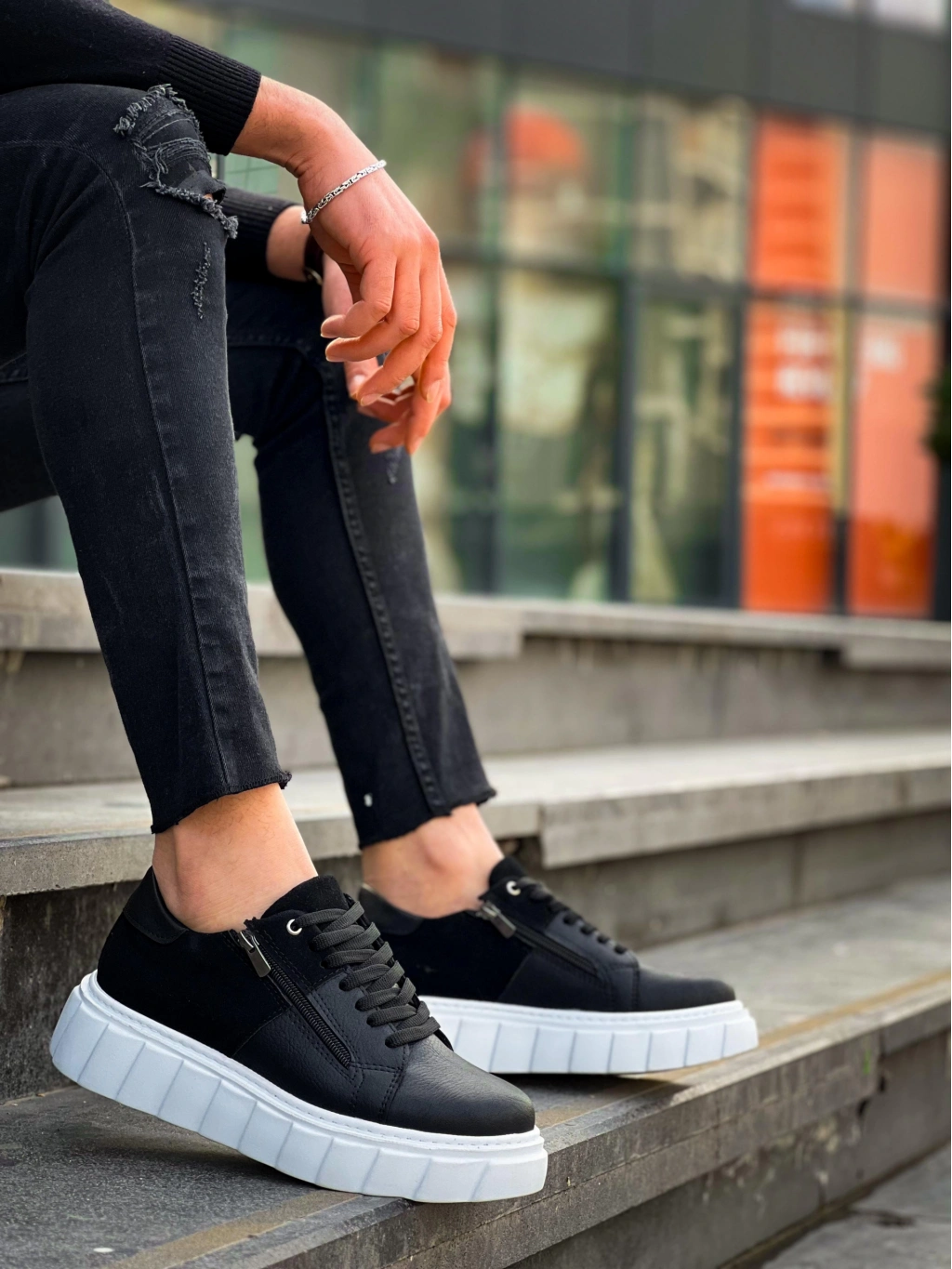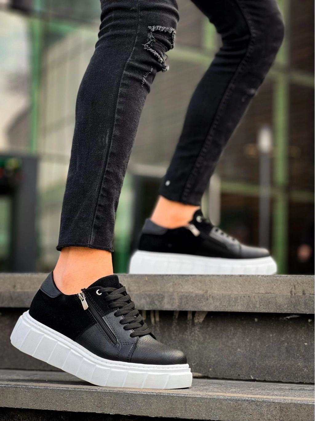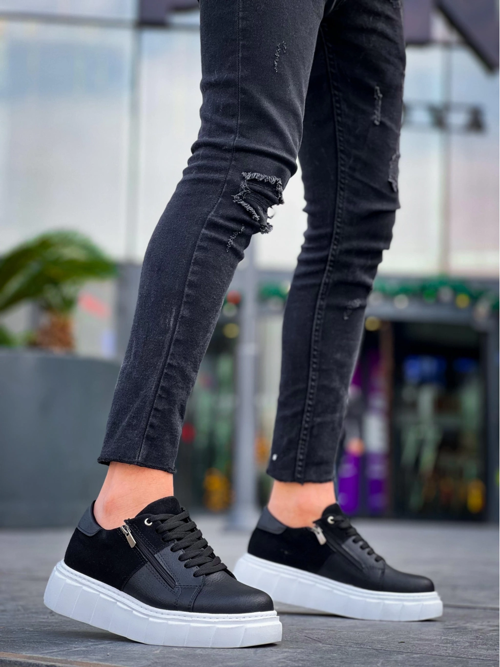 KB-X155 Siyah Cilt Siyah Süet Detaylı Beyaz Yüksek Taban Günlük Spor Ayakkabı