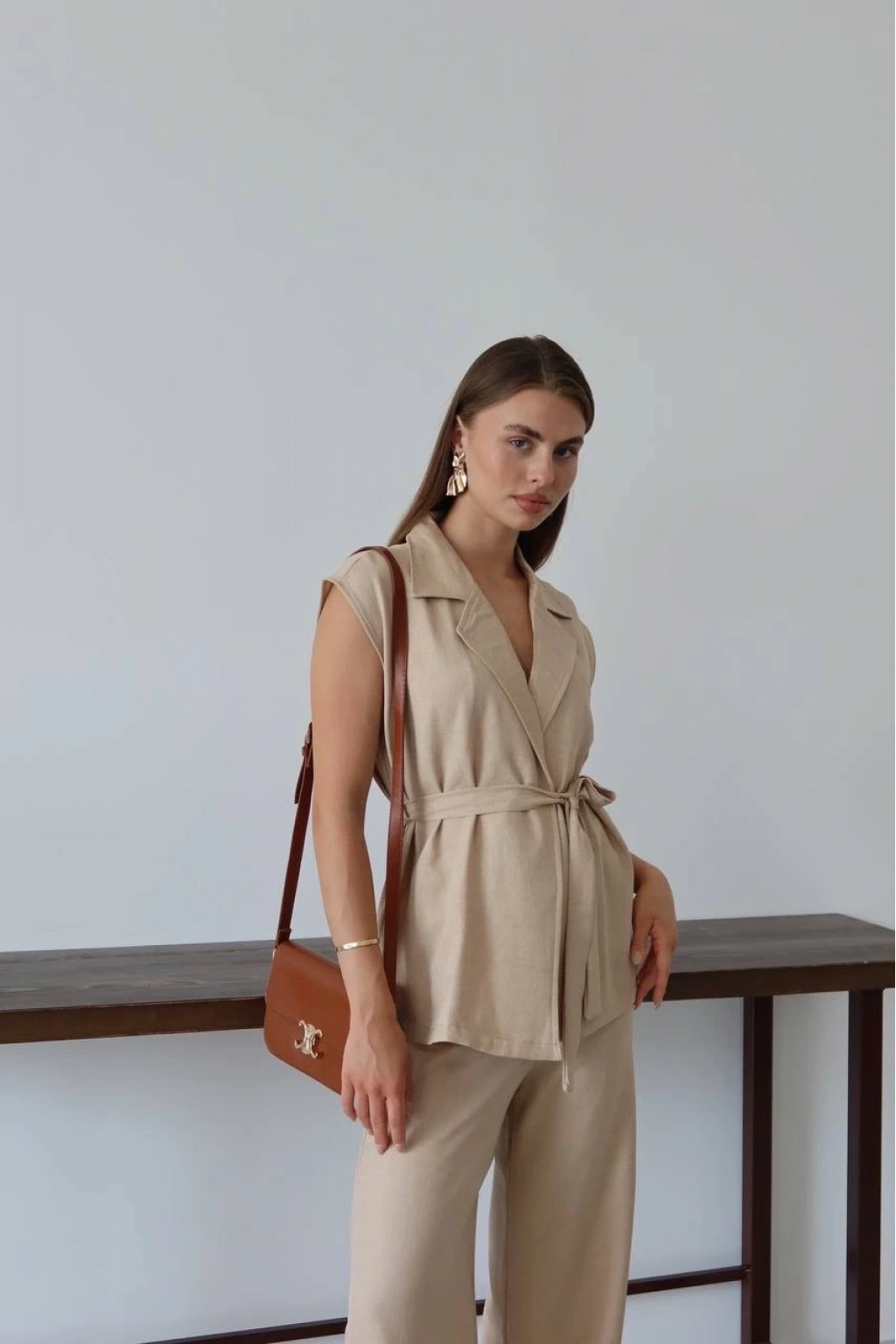 keten yelek pantolon takım bej rengi ile şıklığı ve rahatlığı bir arada sunuyor.