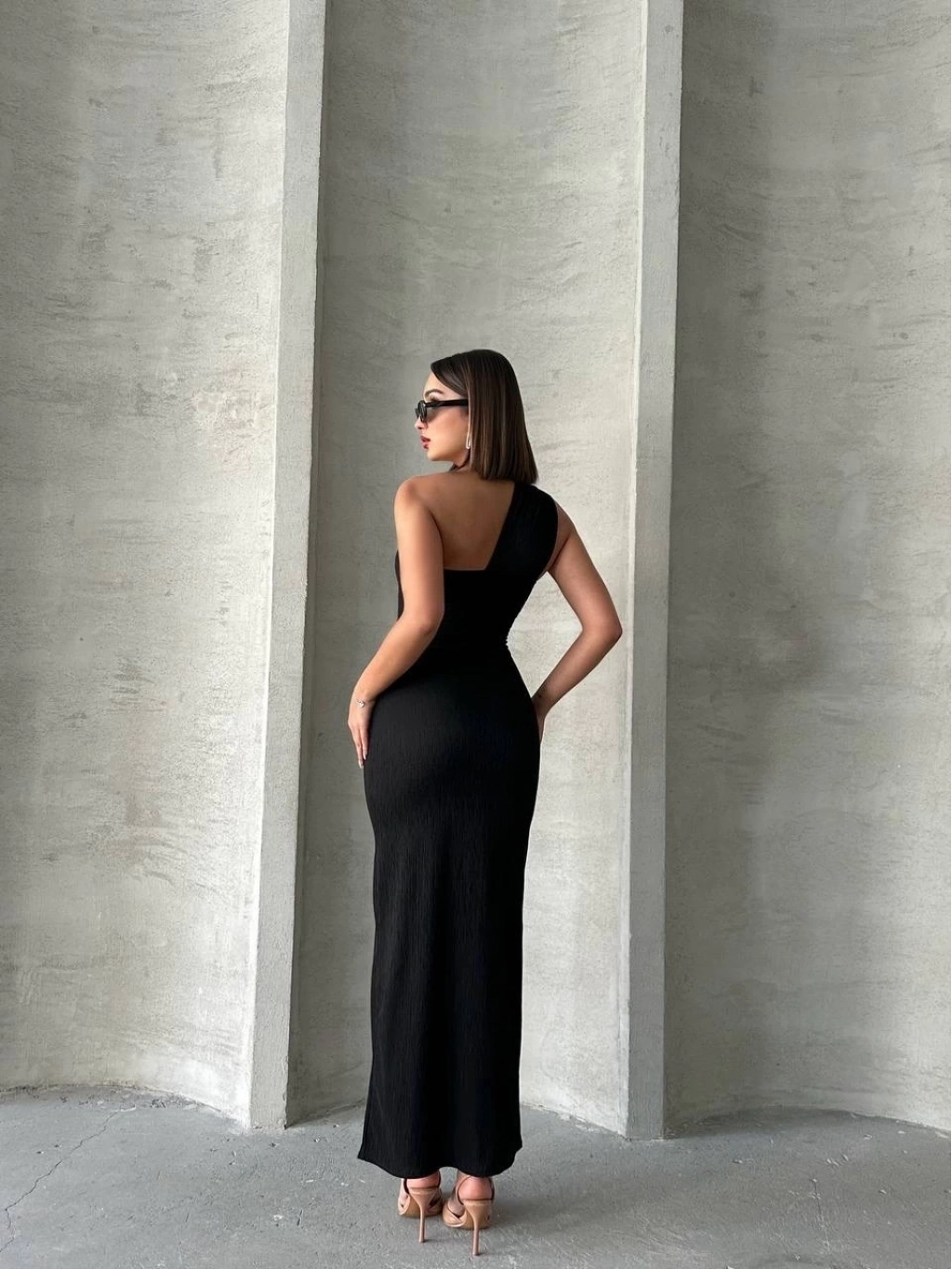 Krinkıl tek omuz uzun elbise siyah, şıklığı ve rahatlığı bir arada sunar.
