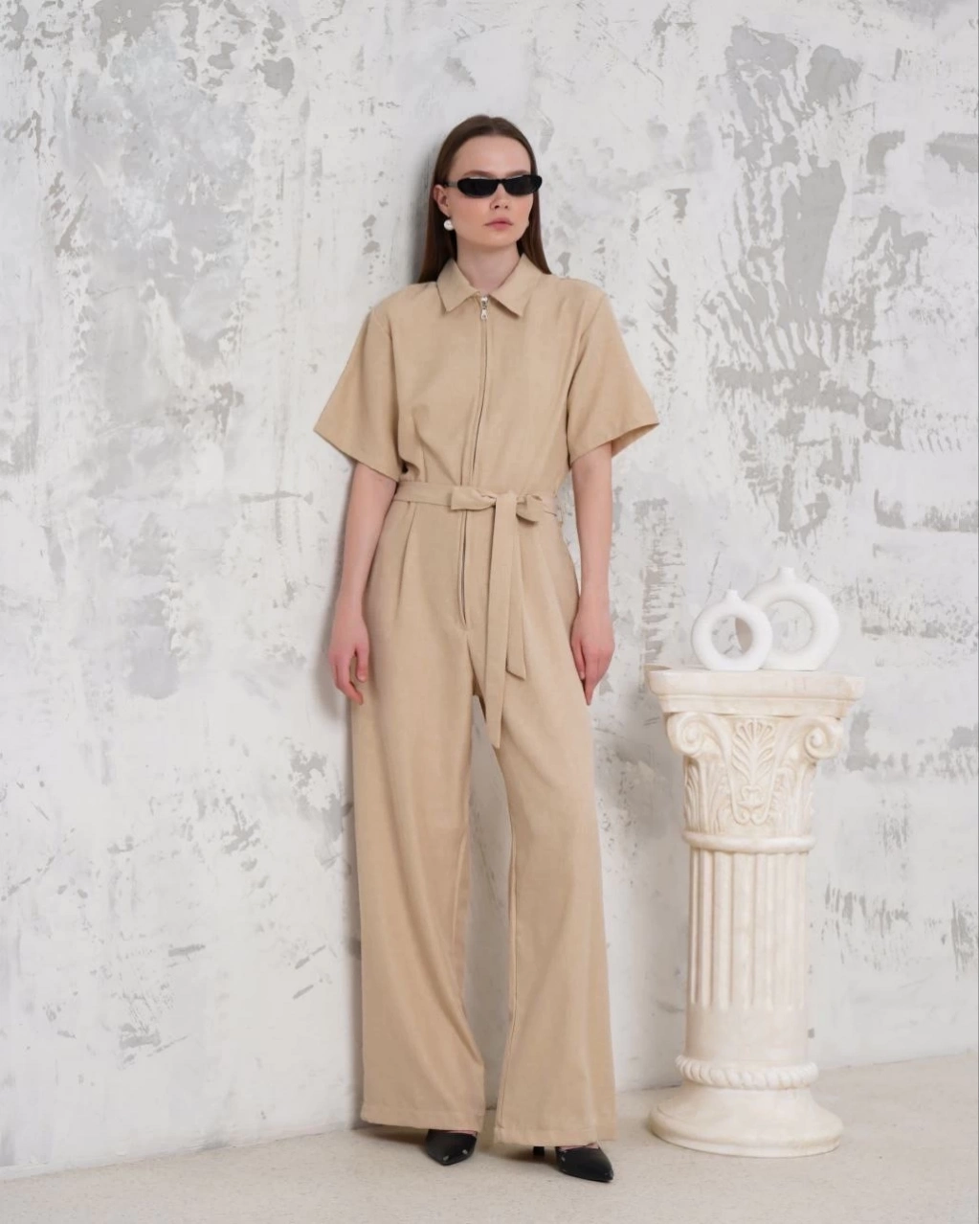 Kuşaklı gömlek yaka salaş tulum bej s255822