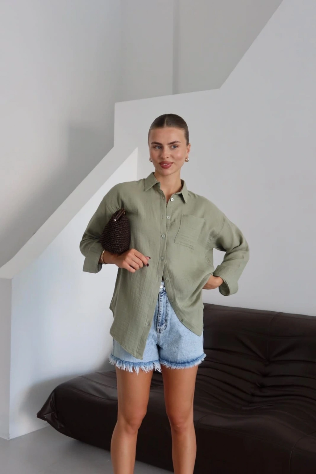Bu haki rengiyle şıklığı ve rahatlığı bir arada sunan tek cepli müslin gömlek, gardırobunuzun vazgeçilmezi olmaya aday! Yuvarlak yakalı ve düğmeli olan bu gömleğin özellikleri şöyle: