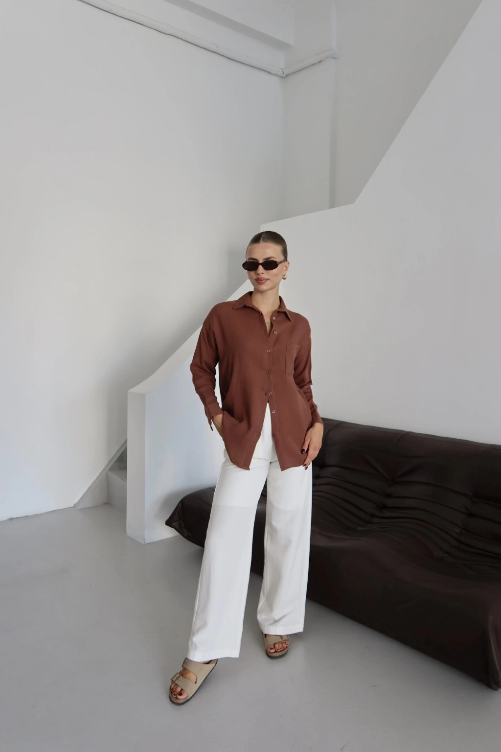 Tek cepli müslin gömlek kahve pt
