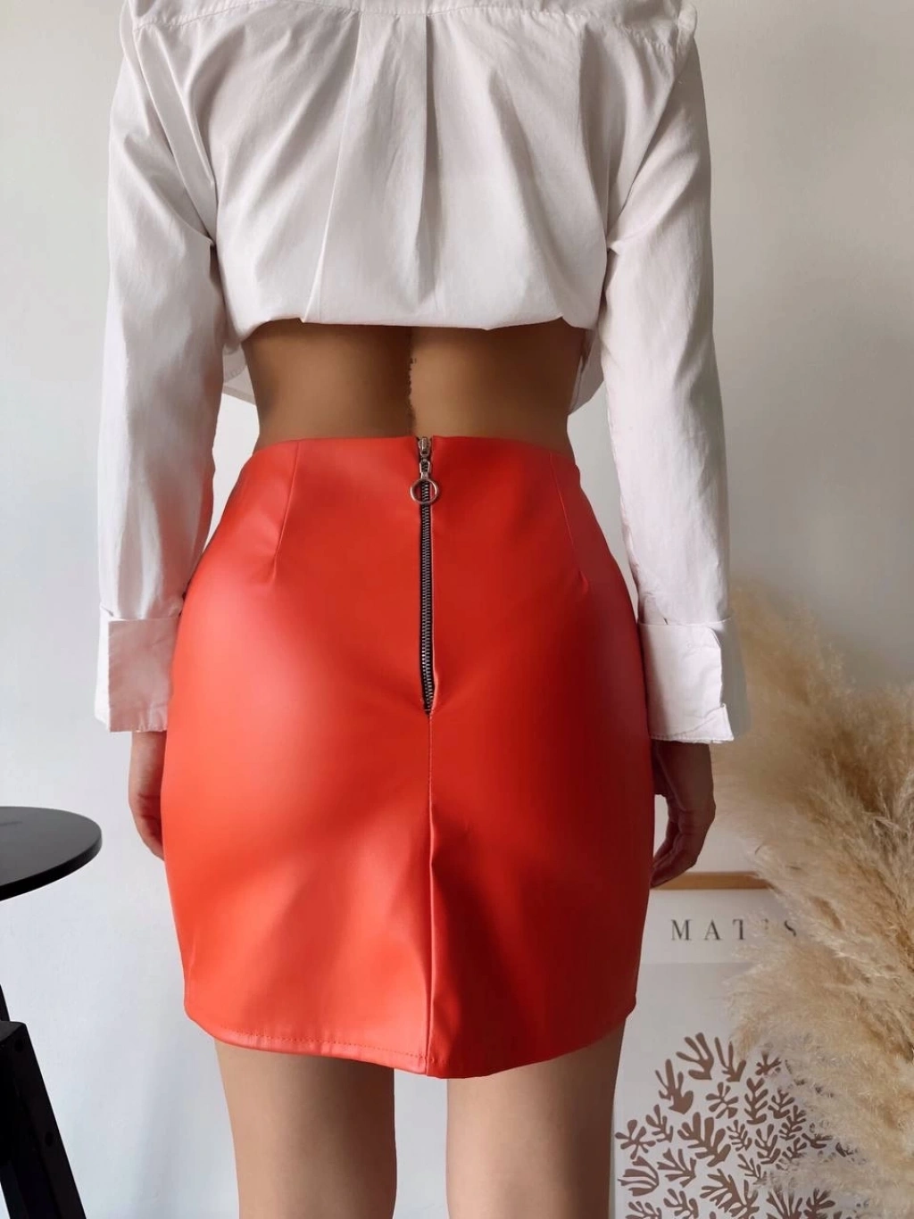 • Tek yırtmaçlı arkadan fermuarlı deri etek turuncu s24475