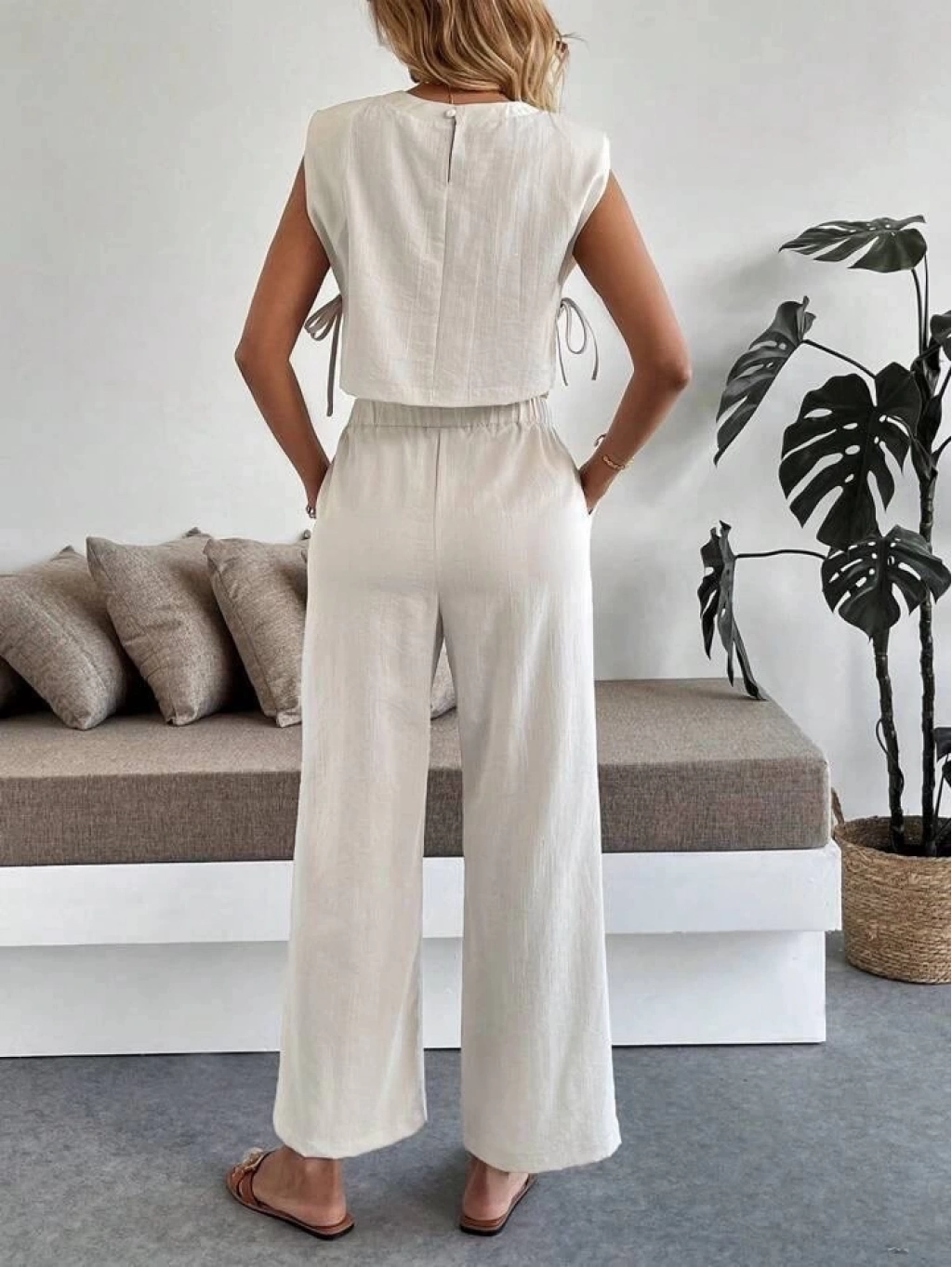 Yan bağlama detaylı pantolonlu takım bej, zarif ve şık bir seçenektir. Tarzınızı yansıtmak için ideal bir tercihtir.