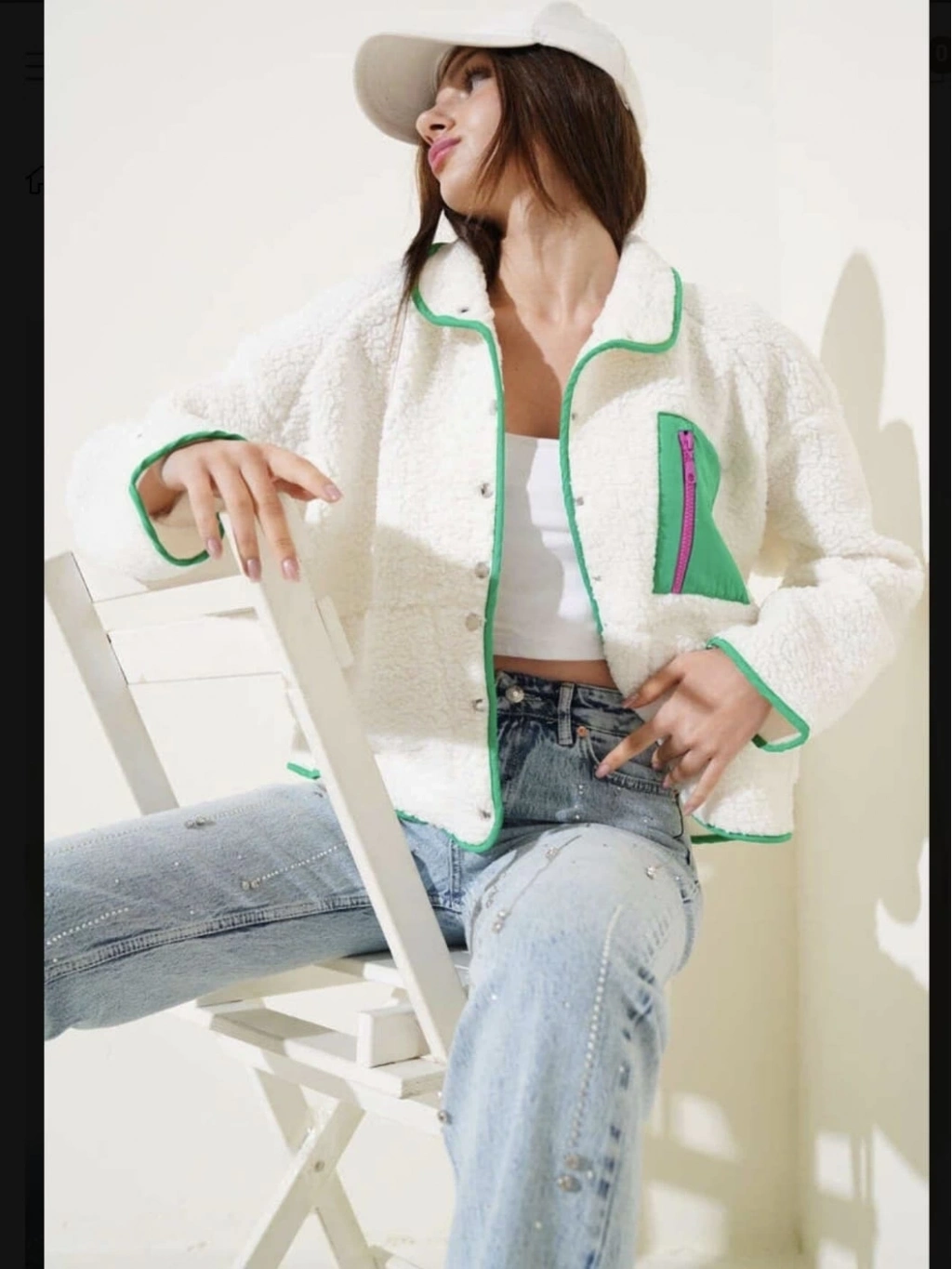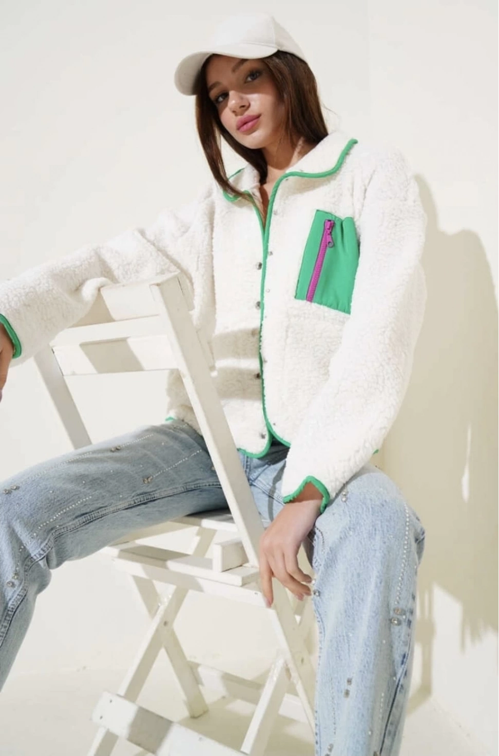 Yeşil fermuar cepli kuzu mont beyaz t1085