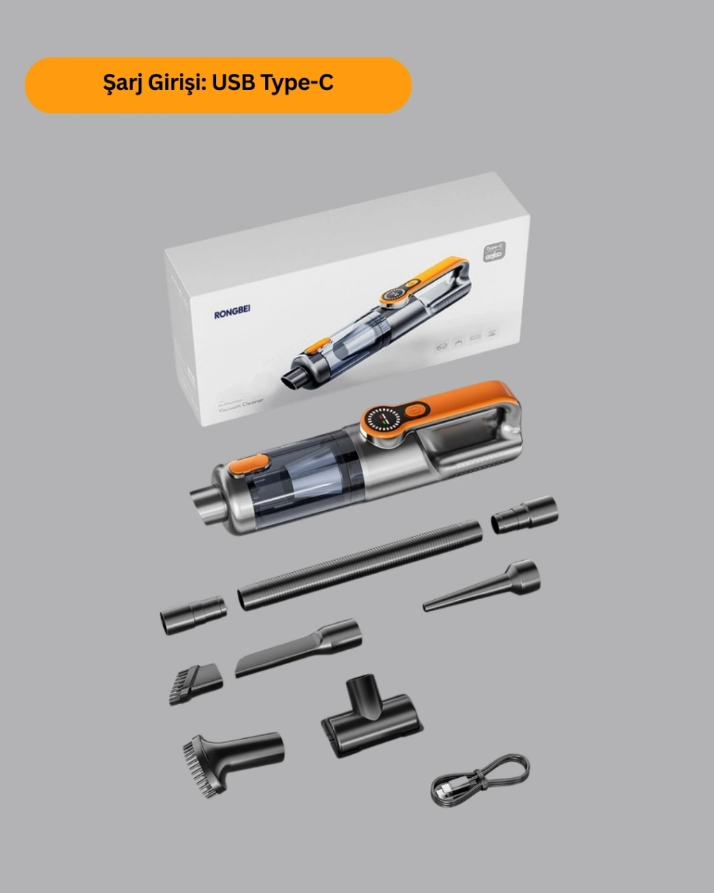 Güçlü motor yapısına sahip bu mini el süpürgesi, kuru ve sıvı kirleri saniyeler içinde temizleyerek etkili temizlik performansı sunar. Toz, saç, kırıntı, evcil hayvan tüyü ve dökülen sıvılar gibi birçok kir türünde yüksek verim sağlar. Set içerisinde bulunan numaratör hediyesi.USB Type-C hızlı şarj özelliği ile kısa sürede şarj olur ve 25–30 dakika boyunca kesintisiz çalışabilir. Kablosuz yapısı sayesinde dar alanlarda ve araç içinde kullanım kolaylığı sağlar.5 başlık aparatı ile donatılmış cihaz; dar uçlu başlıkla detay temizliği, fırçalı başlıkla hassas yüzey temizliği, geniş başlıkla genel yüzey temizliği, yuvarlak başlıkla köşe temizliği ve esnek hortumla zor ulaşılan yerlerde üstün performans sunar.Yıkanabilir toz haznesi hijyenik kullanım sağlar. Kompakt boyutu sayesinde çekmece, torpido veya çantalarda kolayca saklanabilir.
