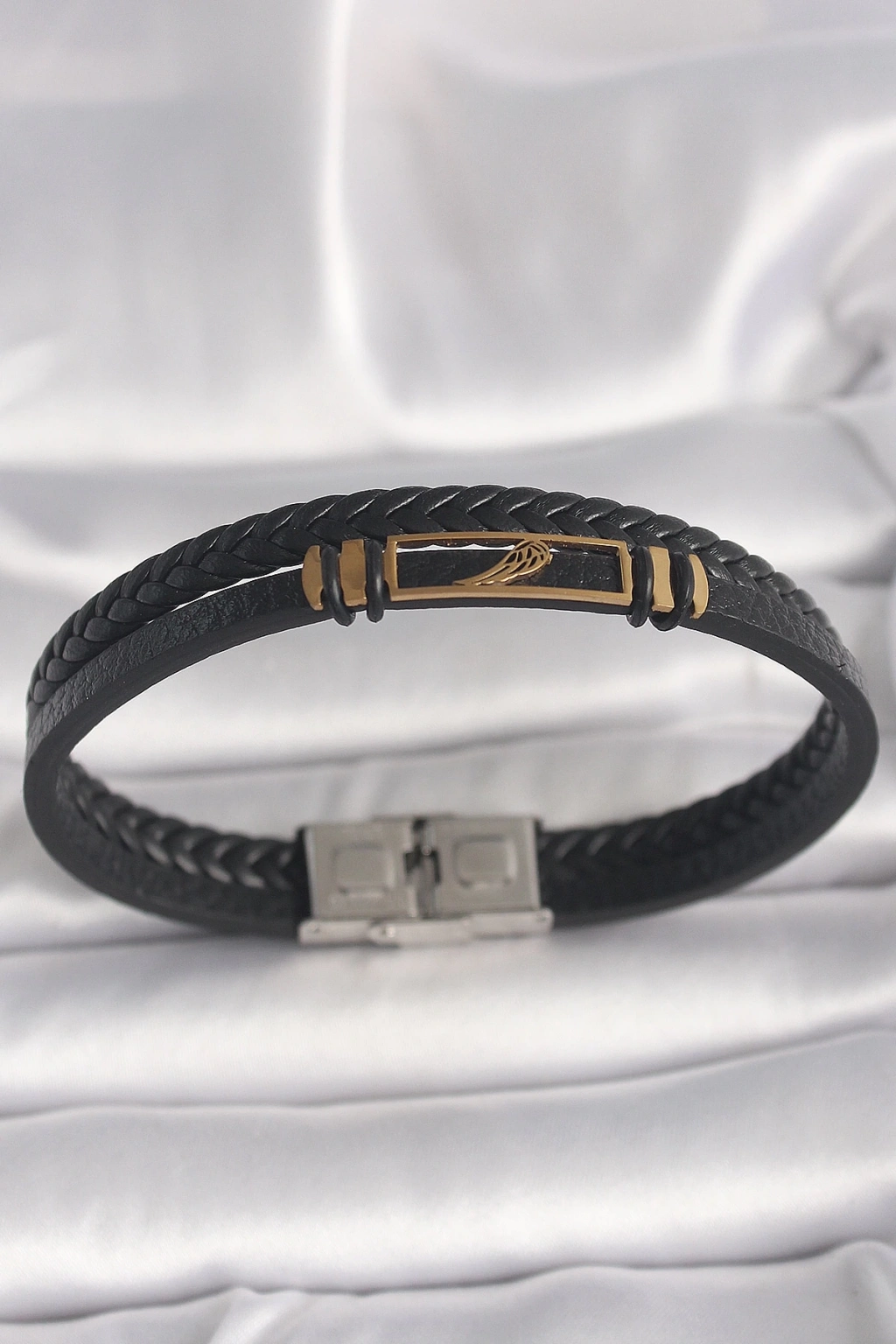 ® 316L Çelik Gold Renk Kanat Aksesuarlı Siyah Burgu Model Deri Kordon Erkek Bileklik