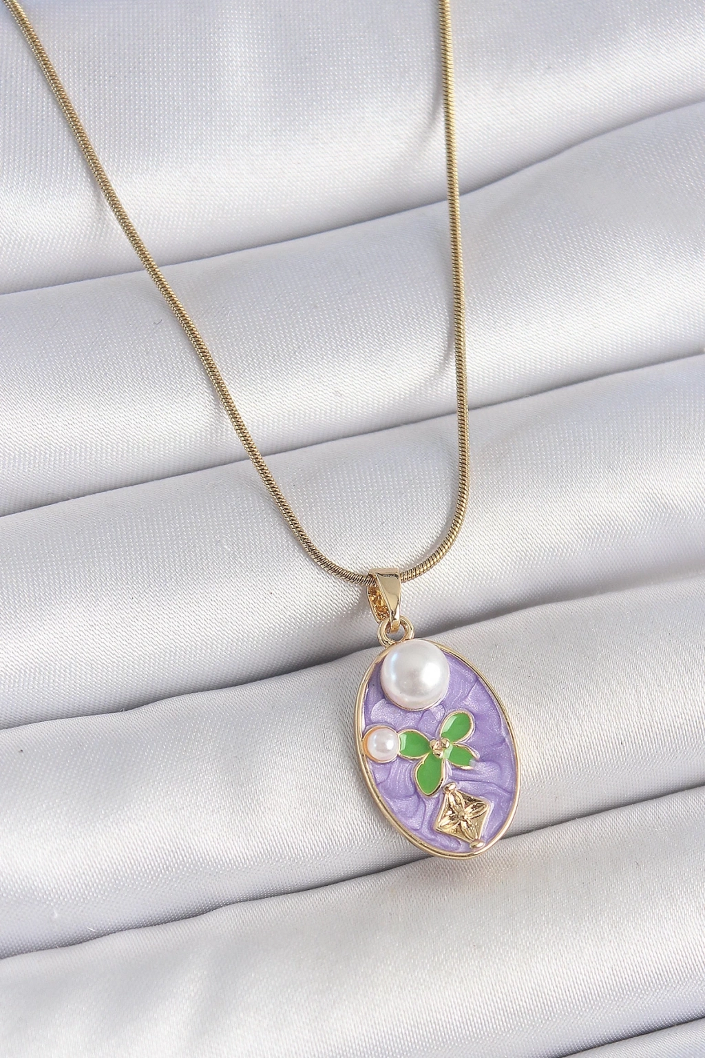 ® 316L Çelik Gold Renk Zincir Mor Mineli Oval İncili Çiçek İşlemeli Portre Model Kadın Kolye