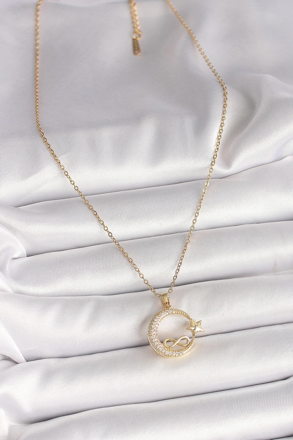 ® 316L Çelik Gold Renk Zincir Zirkon Taşlı Ay Yıldız Model Sonsuzluk Detay Kadın Kolye