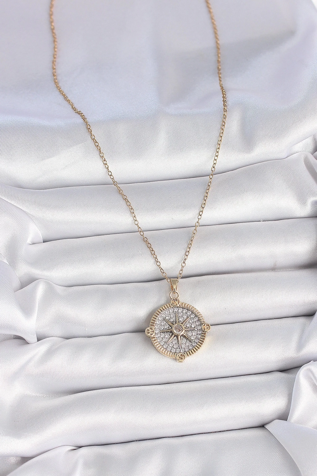 ® 316L Çelik Gold Renk Zirkon Taşlı Pusula Model Kadın Kolye