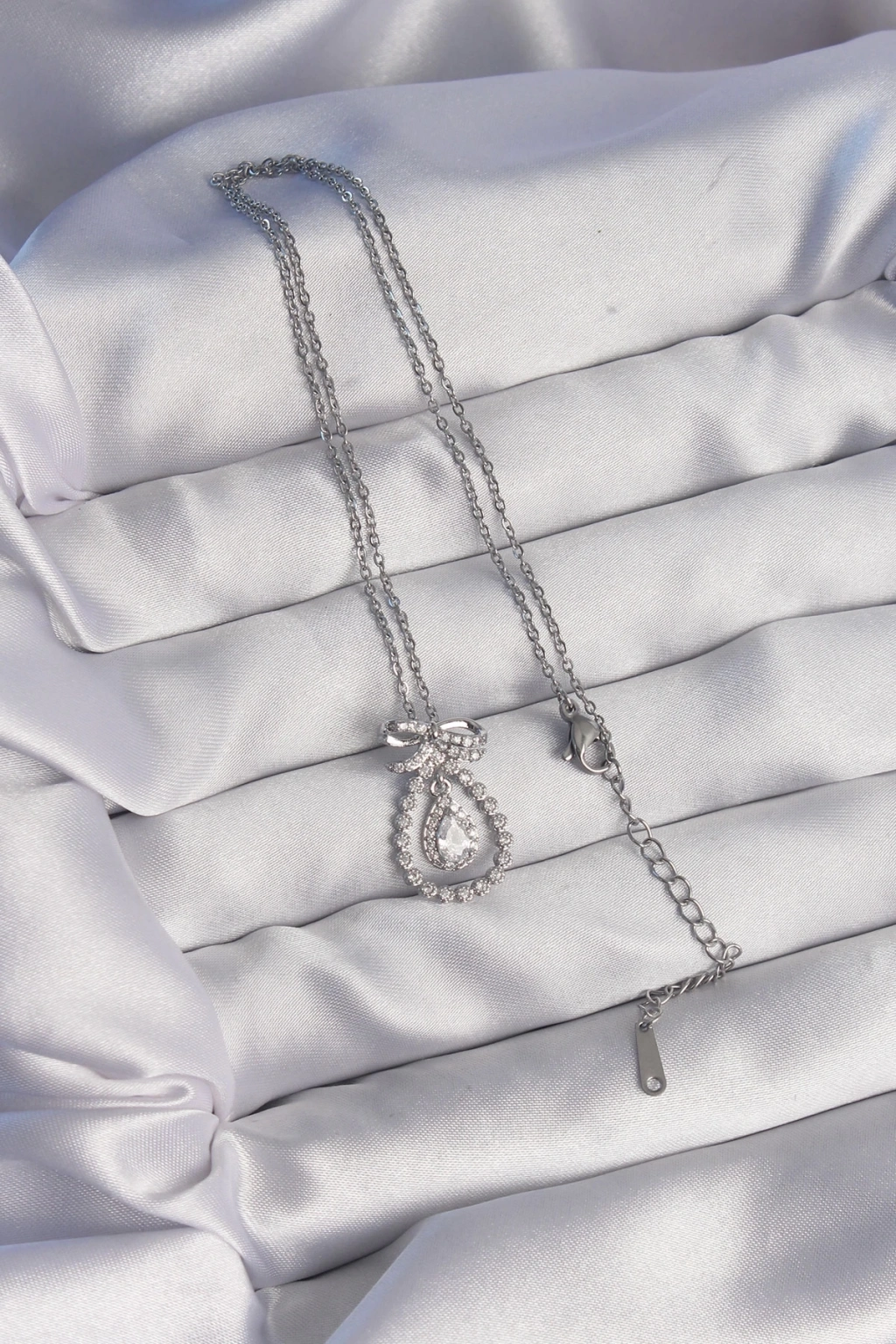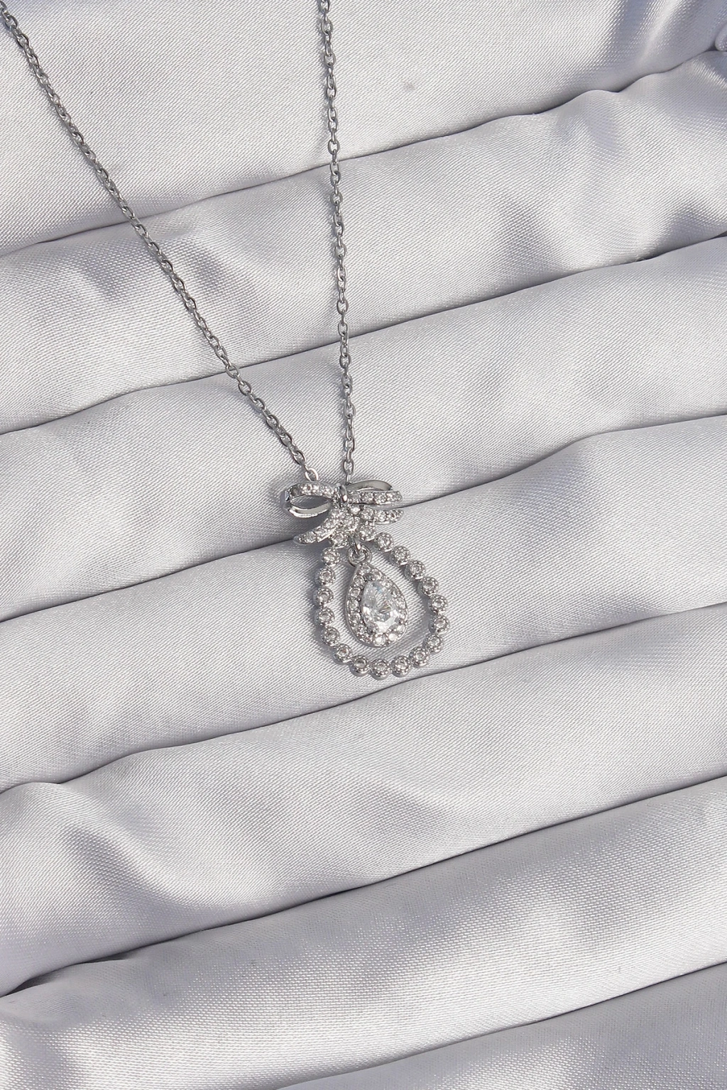® 316L Çelik Gümüş Renk Fiyonk Detaylı Zirkon Taşlı Damla Model Kolye