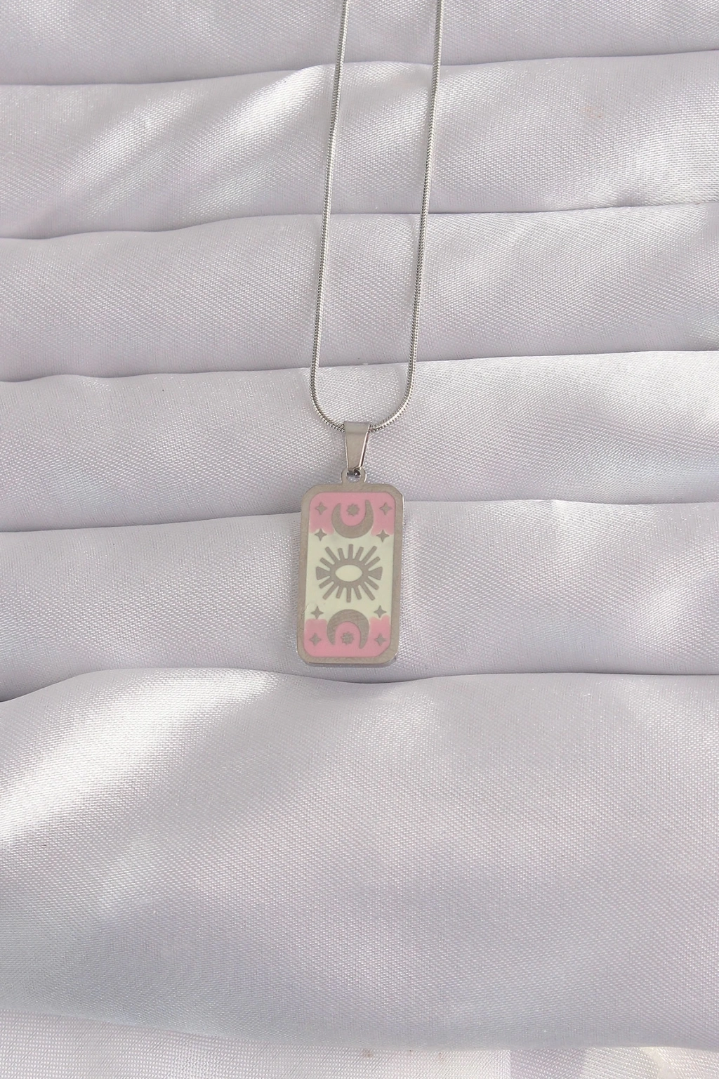 ® 316L Çelik Gümüş Renk Pembe Mineli Ay Figür Tarot Kolye