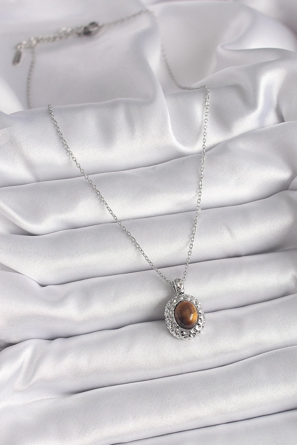 ® 316L Çelik Gümüş Renk Zincir Kehribar Boncuk Model Kadın Kolye
