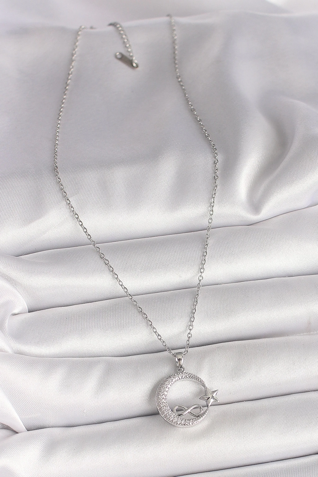 ® 316L Çelik Gümüş Renk Zincir Zirkon Taşlı Ay Yıldız Model Sonsuzluk Detay Kadın Kolye