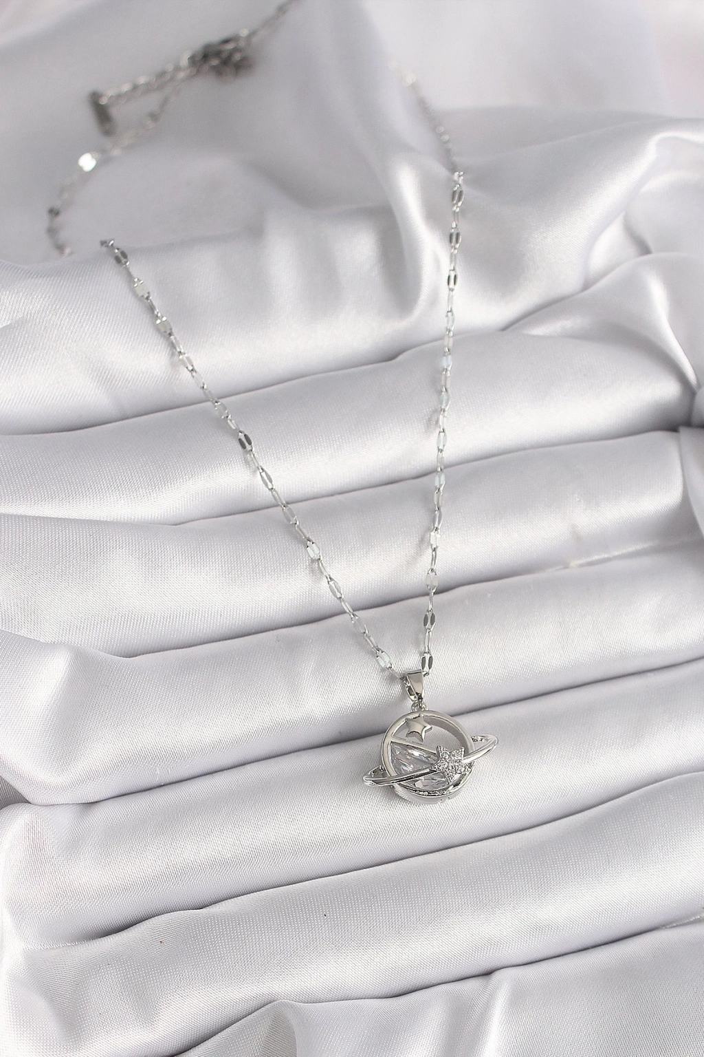 ® 316L Çelik Gümüş Renk Zincir Zirkon Taşlı Yıldız Detay Gezegen Model Kadın Kolye