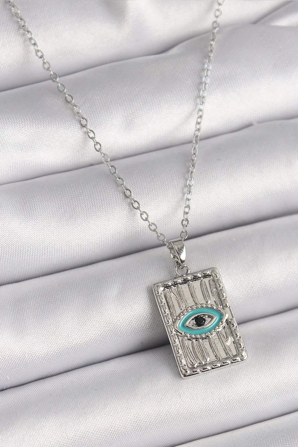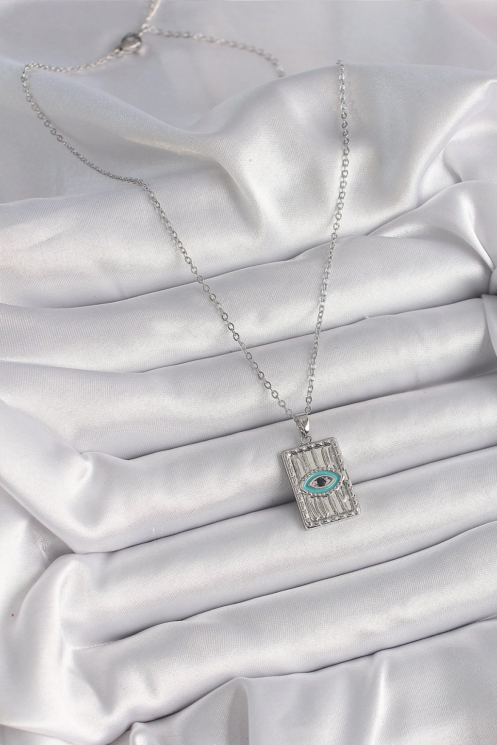 ® 316L Çelik Gümüş Renk Zirkon Taşlı Göz İşleme Detaylı Plaka Model Kadın Kolye